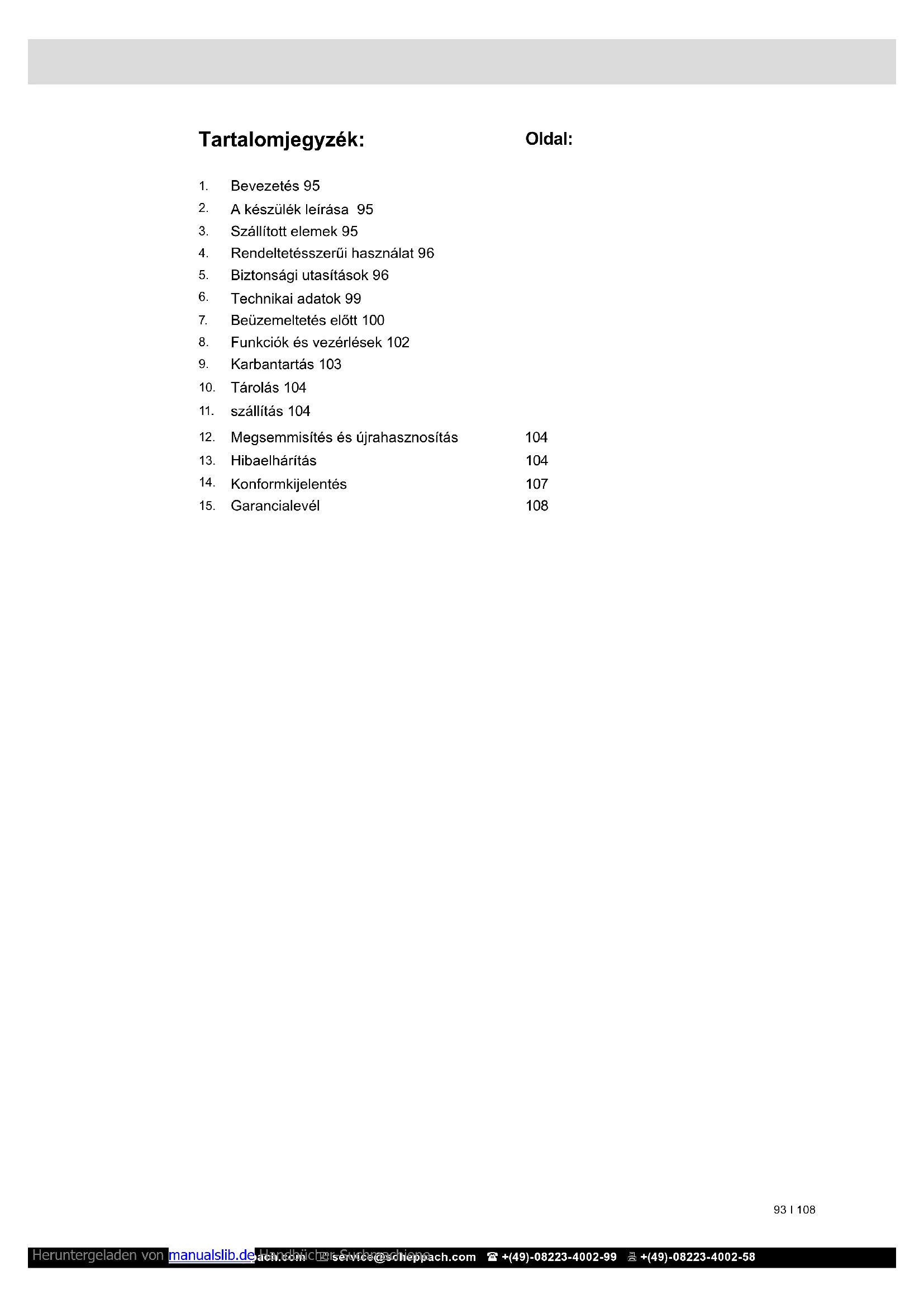 Az ártalmatlanítással kapcsolatos utasítások a ké- szüléken, ill. a csomagoláson található piktogramok- ból következnek. Ezek jelentését megtalálhatja „A ké- szüléken található szimbólumok magyarázata“ című fejezetben. A szállítási csomagolás ártalmatlanítása A készüléket a csomagolás védi a szállítási károk el- len. A csomagolóanyagok kiválasztásában általában fontos szerepet játszik az a szempont, hogy környe- zetkímélők és könnyen ártalmatlaníthatók legyenek, és ezért újrahasznosíthatók. A csomagolás anyag- körforgásba történő visszajuttatása kíméli a nyers- anyagokat és csökkenti a hulladékmennyiséget. A csomagolás részei (például fólia, Styropor®) ve- szélyesek lehetnek a gyermekek számára. Fulladás- veszély áll fenn! A csomagolás részeit gyermekek számára nem elérhető helyen kell tárolni, és ártal- matlanítsa azokat a lehető leggyorsabban.Hibaelhá- rítás Heruntergeladen von manualslib.de Handbücher-Suchmachiene www.scheppach.com service@scheppach.com +(49)-08223-4002-99 +(49)-08223-4002-58 105 I 108 Heruntergeladen von manualslib.de Handbücher-Suchmachiene www.scheppach.com service@scheppach.com +(49)-08223-4002-99 +(49)-08223-4002-58 106 I 108 Heruntergeladen von manualslib.de Handbücher-Suchmachiene www.scheppach.com service@scheppach.com +(49)-08223-4002-99 +(49)-08223-4002-58