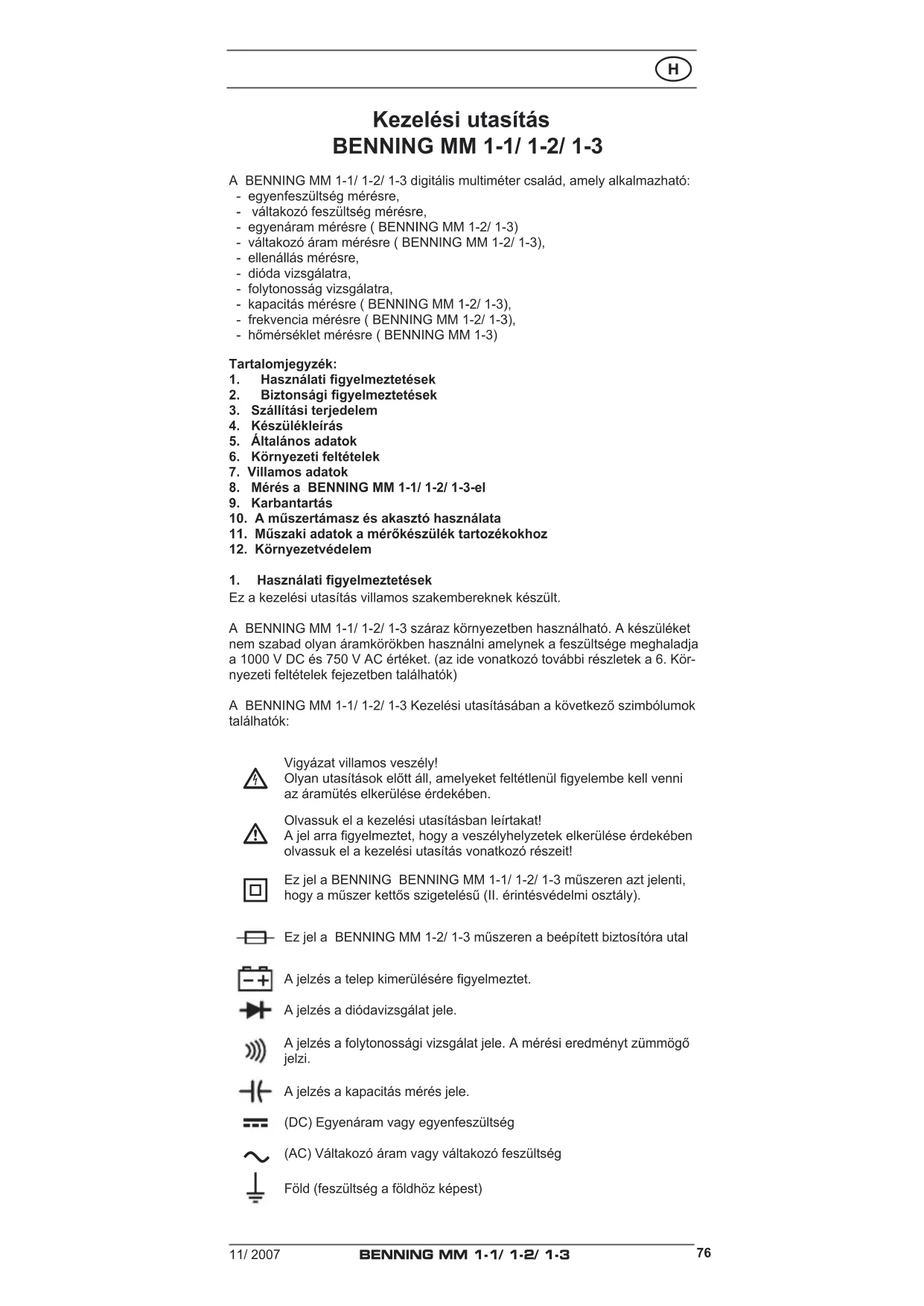 Ez a kezelési utasítás villamos szakembereknek készült. A BENNING MM 1-1/ 1-2/ 1-3 száraz környezetben használható. A készüléket nem szabad olyan áramkörökben használni amelynek a feszültsége meghaladja a 1000 V DC és 750 V AC értéket. (az ide vonatkozó további részletek a 6. Kör- nyezeti feltételek fejezetben találhatók) A BENNING MM 1-1/ 1-2/ 1-3 Kezelési utasításában a következő szimbólumok találhatók: