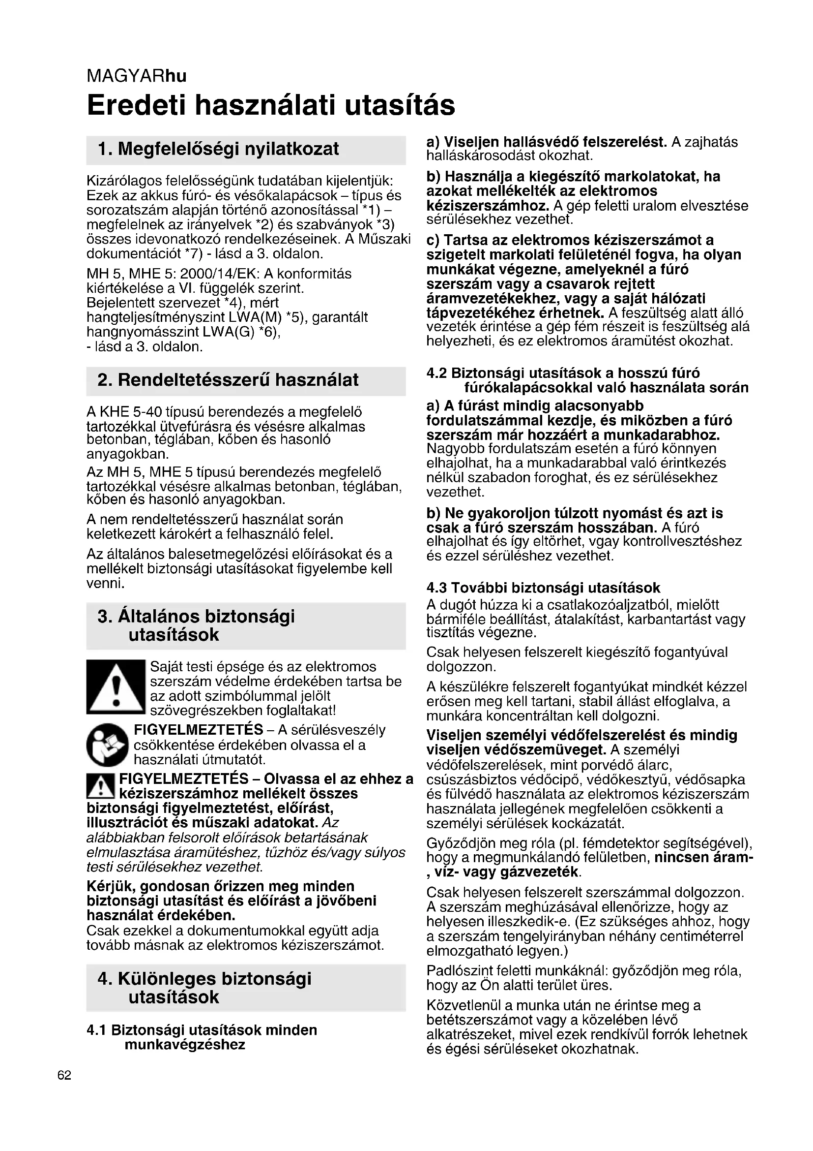 4.2 Biztonsági utasítások a hosszú fúró fúrókalapácsokkal való használata során