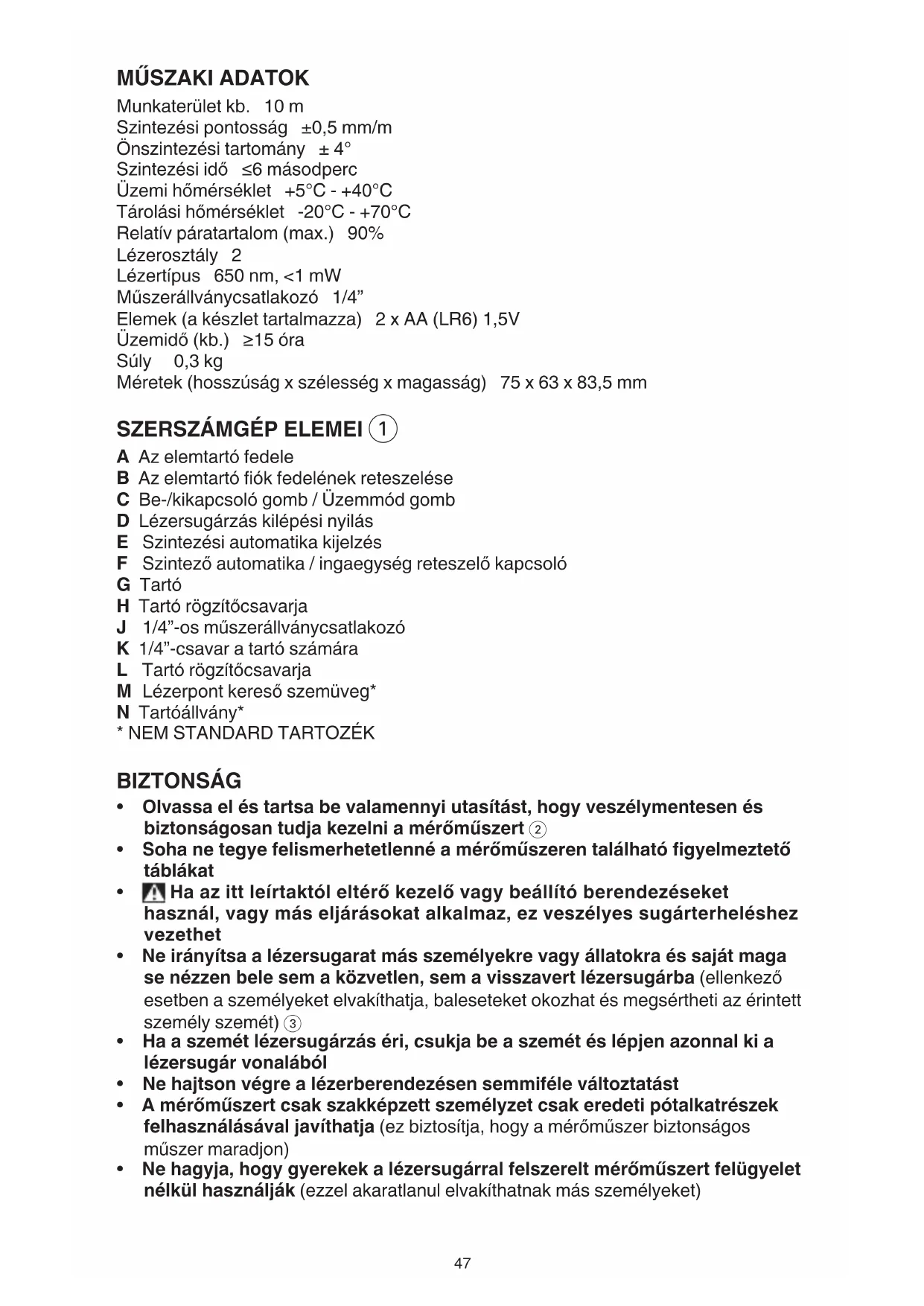 A Az elemtartó fedele B Az elemtartó fiók fedelének reteszelése C Be-/kikapcsoló gomb / Üzemmód gomb D Lézersugárzás kilépési nyilás E Szintezési automatika kijelzés F Szintező automatika / ingaegység reteszelő kapcsoló G Tartó H Tartó rögzítőcsavarja J 1/4”-os műszerállványcsatlakozó K 1/4”-csavar a tartó számára L Tartó rögzítőcsavarja M Lézerpont kereső szemüveg* N Tartóállvány*
