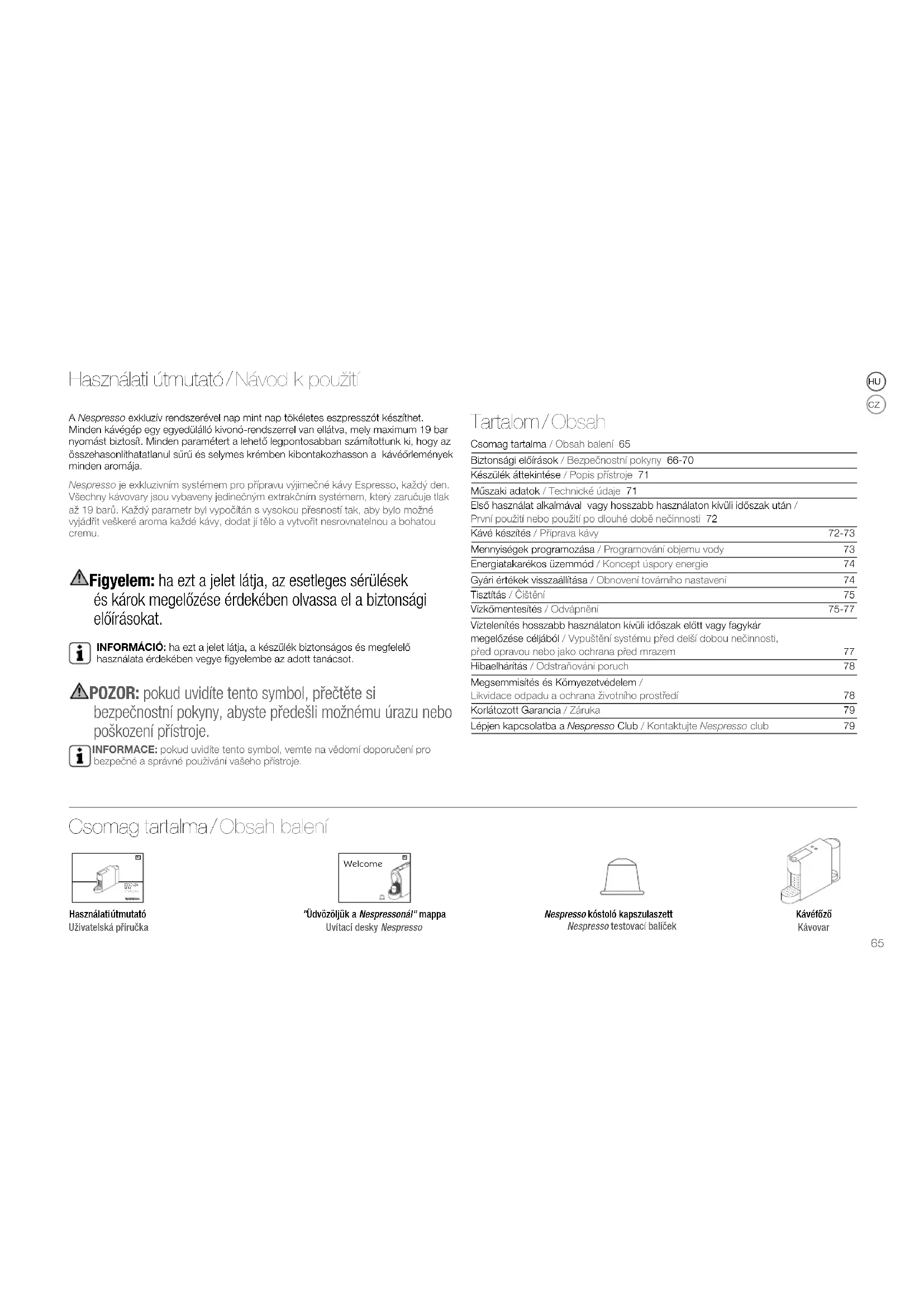 Használati útmutató / Návod k použití A Nespresso exkluzív rendszerével nap mint nap tökéletes eszpresszót készíthet. Minden kávégép egy egyedülálló kivonó-rendszerrel van ellátva, mely maximum 19 bar nyomást biztosít. Minden paramétert a lehető legpontosabban számítottunk ki, hogy az összehasonlíthatatlanul sűrű és selymes krémben kibontakozhasson a kávéőrlemények minden aromája. Nespresso je exkluzivním systémem pro přípravu výjimečné kávy Espresso, každý den. Všechny kávovary jsou vybaveny jedinečným extrakčním systémem, který zaručuje tlak až 19 barů. Každý parametr byl vypočítán s vysokou přesností tak, aby bylo možné vyjádřit veškeré aroma každé kávy, dodat jí tělo a vytvořit nesrovnatelnou a bohatou cremu. Figyelem: ha ezt a jelet látja, az esetleges sérülések és károk megelőzése érdekében olvassa el a biztonsági előírásokat.