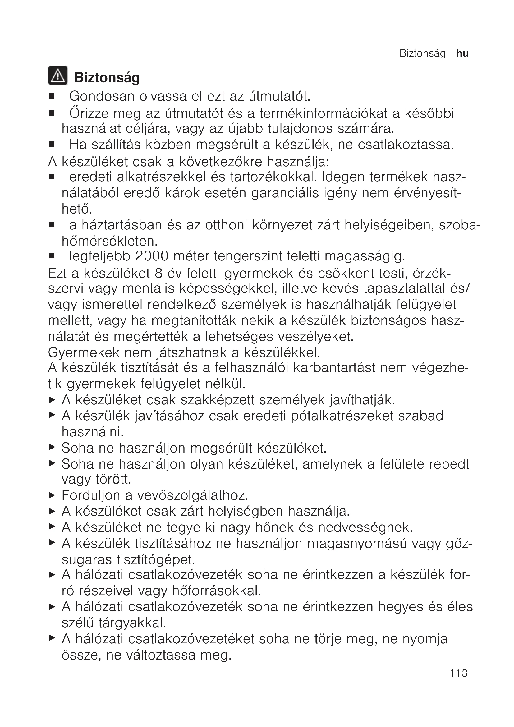Biztonság ¡ Gondosan olvassa el ezt az útmutatót. ¡ Őrizze meg az útmutatót és a termékinformációkat a későbbi használat céljára, vagy az újabb tulajdonos számára. ¡ Ha szállítás közben megsérült a készülék, ne csatlakoztassa. A készüléket csak a következőkre használja: ¡ eredeti alkatrészekkel és tartozékokkal. Idegen termékek hasz- nálatából eredő károk esetén garanciális igény nem érvényesít- hető. ¡ a háztartásban és az otthoni környezet zárt helyiségeiben, szoba- hőmérsékleten. ¡ legfeljebb 2000 méter tengerszint feletti magasságig. Ezt a készüléket 8év feletti gyermekek és csökkent testi, érzék- szervi vagy mentális képességekkel, illetve kevés tapasztalattal és/ vagy ismerettel rendelkező személyek is használhatják felügyelet mellett, vagy ha megtanították nekik a készülék biztonságos hasz- nálatát és megértették a lehetséges veszélyeket. Gyermekek nem játszhatnak a készülékkel. A készülék tisztítását és a felhasználói karbantartást nem végezhe- tik gyermekek felügyelet nélkül.