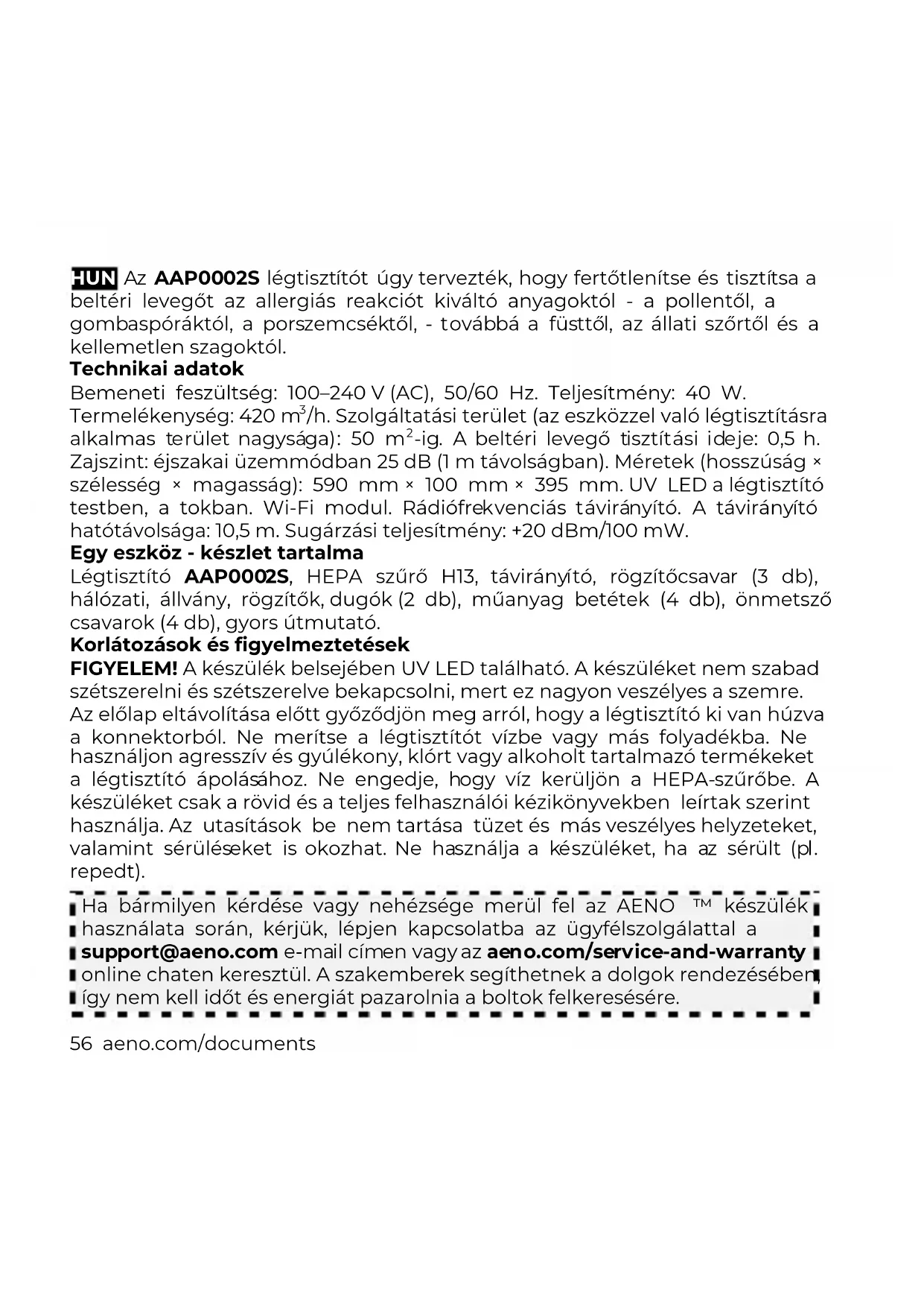 *Ako veza ne uspije, provjerite je li uređaj spojen na izvor napajanja i uključen te da li ikona Wi-Fi na upravljačkoj ploči uređaja trepće. Dodatno provjerite Wi-Fi postavke usmjerivača (aeno.com/router-help) ili ga ponovno pokrenite, a zatim ponovite postupak povezivanja.56 aeno.com/documents HUN Az AAP0002S légtisztítót úgy tervezték, hogy fertőtlenítse és tisztítsa a beltéri levegőt az allergiás reakciót kiváltó anyagoktól - a pollentől, a gombaspóráktól, a porszemcséktől, - továbbá a füsttől, az állati szőrtől és a kellemetlen szagoktól. Technikai adatok Bemeneti feszültség: 100–240 V (AC), 50/60 Hz. Teljesítmény: 40 W. Termelékenység: 420 m