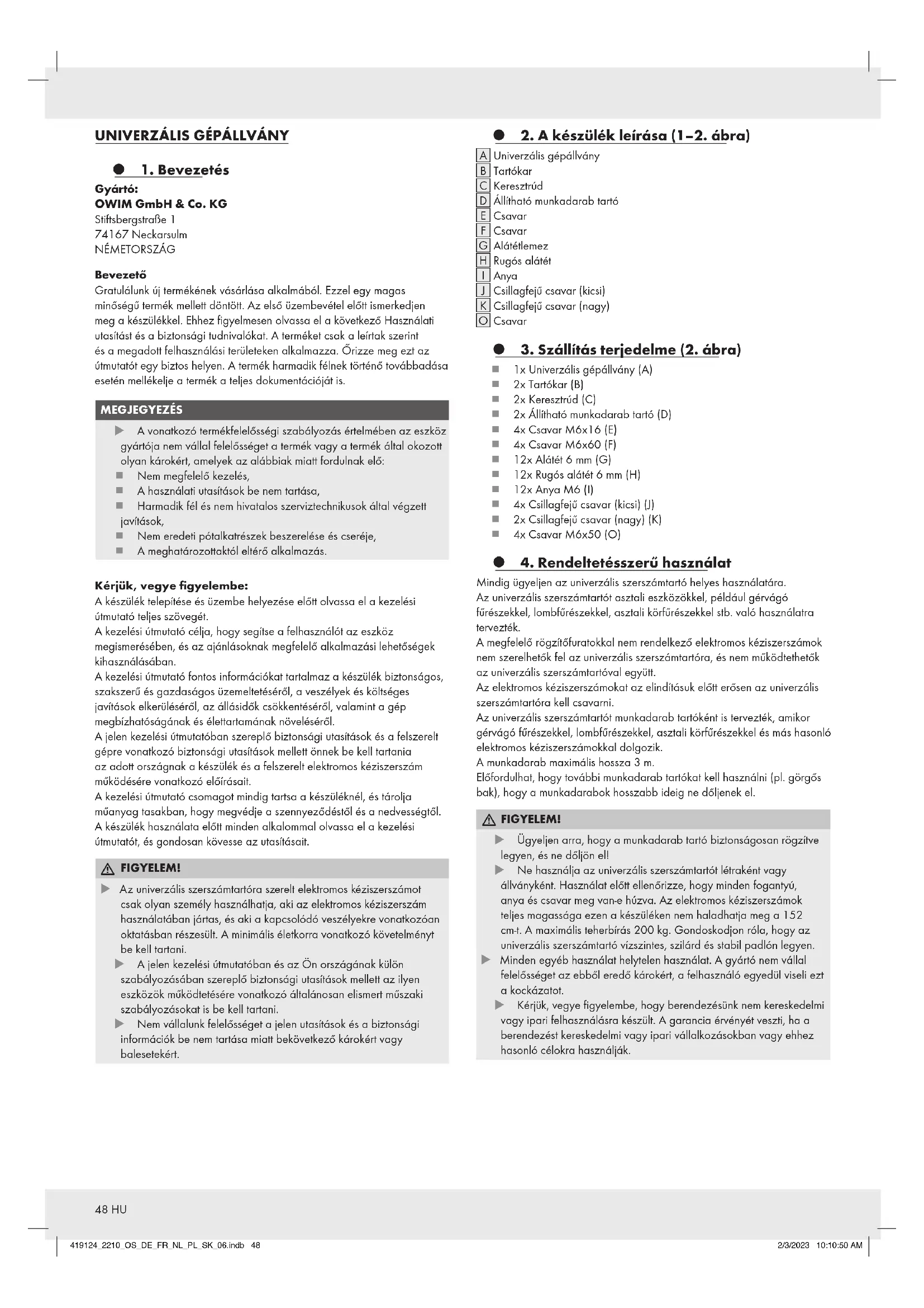FIGYELEM! u Ügyeljen arra, hogy a munkadarab tartó biztonságosan rögzítve legyen, és ne dőljön el! u Ne használja az univerzális szerszámtartót létraként vagy állványként. Használat előtt ellenőrizze, hogy minden fogantyú, anya és csavar meg van-e húzva. Az elektromos kéziszerszámok teljes magassága ezen a készüléken nem haladhatja meg a 152 cm-t. A maximális teherbírás 200 kg. Gondoskodjon róla, hogy az univerzális szerszámtartó vízszintes, szilárd és stabil padlón legyen. u Minden egyéb használat helytelen használat. A gyártó nem vállal felelősséget az ebből eredő károkért, a felhasználó egyedül viseli ezt a kockázatot. u Kérjük, vegye figyelembe, hogy berendezésünk nem kereskedelmi vagy ipari felhasználásra készült. A garancia érvényét veszti, ha a berendezést kereskedelmi vagy ipari vállalkozásokban vagy ehhez hasonló célokra használják. 419124_2210_OS_DE_FR_NL_PL_SK_06.indb 48419124_2210_OS_DE_FR_NL_PL_SK_06.indb 48 2/3/2023 10:10:50 AM2/3/2023 10:10:50 AM49HU