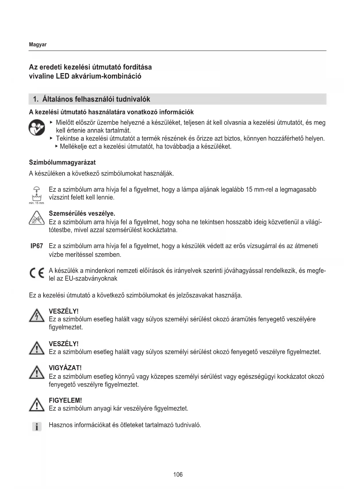 A kezelési útmutató használatára vonatkozó információk ▶ Mielőtt először üzembe helyezné a készüléket, teljesen át kell olvasnia a kezelési útmutatót, és meg kell értenie annak tartalmát. ▶ Tekintse a kezelési útmutatót a termék részének és őrizze azt biztos, könnyen hozzáférhető helyen. ▶ Mellékelje ezt a kezelési útmutatót, ha továbbadja a készüléket. Szimbólummagyarázat A készüléken a következő szimbólumokat használják. Ez a szimbólum arra hívja fel a gyelmet, hogy a lámpa aljának legalább 15 mm-rel a legmagasabb vízszint felett kell lennie. Szemsérülés veszélye. Ez a szimbólum arra hívja fel a gyelmet, hogy soha ne tekintsen hosszabb ideig közvetlenül a világí- tótestbe, mivel azzal szemsérülést kockáztatna. Ez a szimbólum arra hívja fel a gyelmet, hogy a készülék védett az erős vízsugárral és az átmeneti vízbe merítéssel szemben. A készülék a mindenkori nemzeti előírások és irányelvek szerinti jóváhagyással rendelkezik, és megfe- lel az EU-szabványoknak Ez a kezelési útmutató a következő szimbólumokat és jelzőszavakat használja. VESZÉLY! Ez a szimbólum esetleg halált vagy súlyos személyi sérülést okozó áramütés fenyegető veszélyére gyelmeztet. VESZÉLY! Ez a szimbólum esetleg halált vagy súlyos személyi sérülést okozó fenyegető veszélyre gyelmeztet. VIGYÁZAT! Ez a szimbólum esetleg könnyű vagy közepes személyi sérülést vagy egészségügyi kockázatot okozó fenyegető veszélyre gyelmeztet. FIGYELEM! Ez a szimbólum anyagi kár veszélyére gyelmeztet. Hasznos információkat és ötleteket tartalmazó tudnivaló.