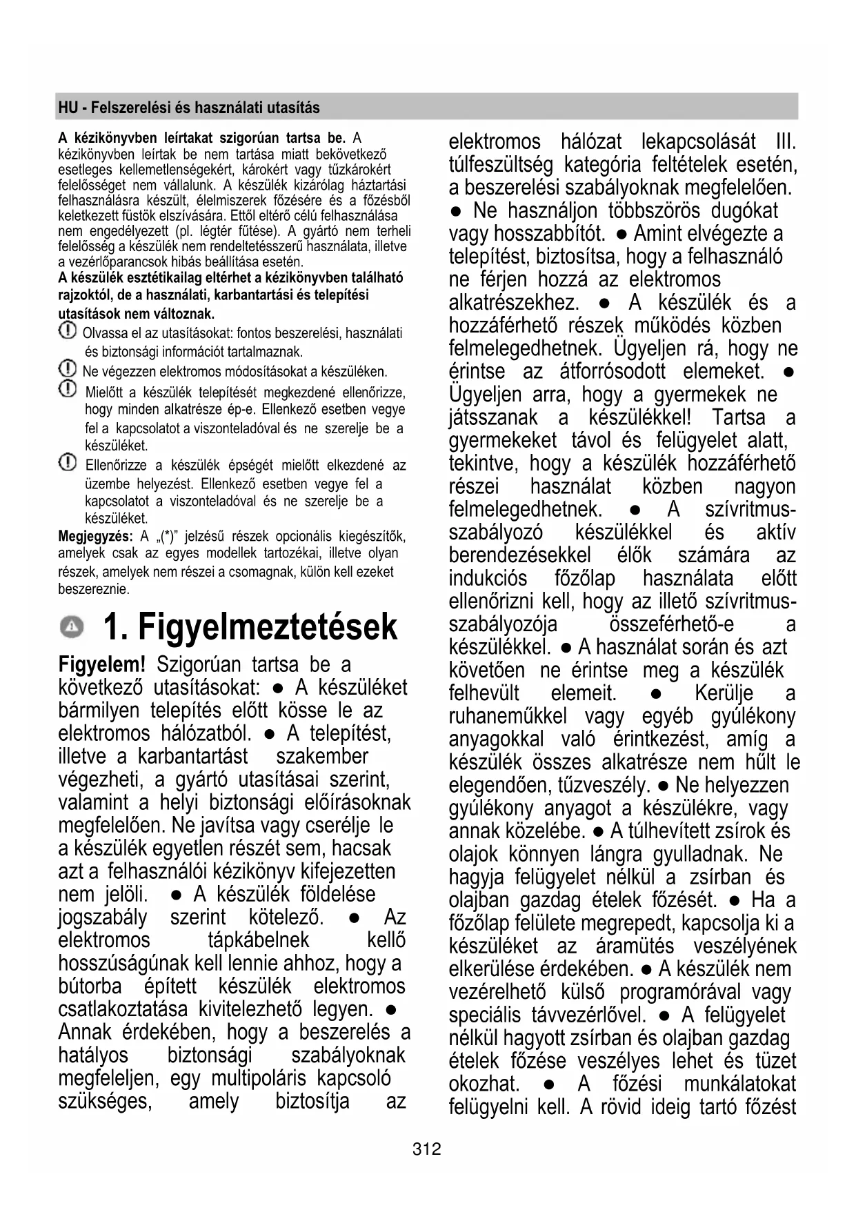 Figyelem! Szigorúan tartsa be a következő utasításokat: ● A készüléket bármilyen telepítés előtt kösse le az elektromos hálózatból. ● A telepítést, illetve a karbantartást szakember végezheti, a gyártó utasításai szerint, valamint a helyi biztonsági előírásoknak megfelelően. Ne javítsa vagy cserélje le a készülék egyetlen részét sem, hacsak azt a felhasználói kézikönyv kifejezetten nem jelöli. ● A készülék földelése jogszabály szerint kötelező. ● Az elektromos tápkábelnek kellő hosszúságúnak kell lennie ahhoz, hogy a bútorba épített készülék elektromos csatlakoztatása kivitelezhető legyen. ● Annak érdekében, hogy a beszerelés a hatályos biztonsági szabályoknak megfeleljen, egy multipoláris kapcsoló szükséges, amely biztosítja az elektromos hálózat lekapcsolását III. túlfeszültség kategória feltételek esetén, a beszerelési szabályoknak megfelelően. ● Ne használjon többszörös dugókat vagy hosszabbítót. ● Amint elvégezte a telepítést, biztosítsa, hogy a felhasználó ne férjen hozzá az elektromos alkatrészekhez. ● A készülék és a hozzáférhető részek működés közben felmelegedhetnek. Ügyeljen rá, hogy ne érintse az átforrósodott elemeket. ● Ügyeljen arra, hogy a gyermekek ne játsszanak a készülékkel! Tartsa a gyermekeket távol és felügyelet alatt, tekintve, hogy a készülék hozzáférhető részei használat közben nagyon felmelegedhetnek. ● A szívritmus- szabályozó készülékkel és aktív berendezésekkel élők számára az indukciós főzőlap használata előtt ellenőrizni kell, hogy az illető szívritmus- szabályozója összeférhető-e a készülékkel. ● A használat során és azt követően ne érintse meg a készülék felhevült elemeit. ● Kerülje a ruhaneműkkel vagy egyéb gyúlékony anyagokkal való érintkezést, amíg a készülék összes alkatrésze nem hűlt le elegendően, tűzveszély. ● Ne helyezzen gyúlékony anyagot a készülékre, vagy annak közelébe. ● A túlhevített zsírok és olajok könnyen lángra gyulladnak. Ne hagyja felügyelet nélkül a zsírban és olajban gazdag ételek főzését. ● Ha a főzőlap felülete megrepedt, kapcsolja ki a készüléket az áramütés veszélyének elkerülése érdekében. ● A készülék nem vezérelhető külső programórával vagy speciális távvezérlővel. ● A felügyelet nélkül hagyott zsírban és olajban gazdag ételek főzése veszélyes lehet és tüzet okozhat. ● A főzési munkálatokat felügyelni kell. A rövid ideig tartó főzést313 folyamatosan felügyelni kell. ● SOHA ne próbálja vízzel eloltani a lángokat. Ellenkezőleg, kapcsolja ki a készüléket és fojtsa el a lángokat, például egy fedővel vagy egy tűzálló pokróccal. Tűzveszély: ne rakodjon a főzőlap felületére. ● Ne használjon gőztisztító gépeket, áramütés veszélye. ● Ne tegyen fém tárgyakat, mint például késeket, villákat, kanalakat és fedőket a főzőlapra, mert azok felforrósodhatnak. ● Mielőtt az elektromos hálózatra kötné a készüléket, ellenőrizze (a készülék alján található) adattáblát, hogy meggyőződjön róla, hogy az azon feltüntetett feszültség és teljesítmény megfelel-e a hálózati és csatlakozóaljzat feszültségének. Amennyiben kétségei lennének, forduljon villanyszerelőhöz. Fontos: ● Használat után a vezérlőszenzorral kapcsolja ki a főzőlapot és ne a lábas érzékelőre hagyatkozzon. ● Kerülje a folyadékok kiömlését. Főzésnél, illetve forralásnál csökkentse a hőfokot. ● Ne hagyja üresen, illetve ne tegyen üres serpenyőt vagy lábast a bekapcsolt melegítő részekre. ● Ha befejezte a főzést, kapcsolja le a vonatkozó főzési területet. ● A főzéshez soha ne használjon alumínium fóliát, és soha ne helyezzen közvetlenül a felületre alumínium fóliába csomagolt termékeket. Az alumínium megolvad és javíthatatlanul tönkreteszi a készüléket. ● Soha ne melegítsen élelmiszert tartalmazó lezárt dobozt vagy konzervet anélkül, hogy felnyitná: felrobbanhat! Ez a figyelmeztetés a többi, más típusú főzőlapra is vonatkozik. ● Az olyan nagy teljesítményű funkciók, mint a booster, nem használható bármilyen típusú folyadék melegítéséhez, mint amilyen például a sütőolaj. A túl magas hőmérséklet veszélyes lehet. Ilyen esetben használjon alacsonyabb teljesítményfokozatot. ● A főzőedényeket közvetlenül a főzőlapra kell helyezni, középre igazítva. Semmilyen esetben se tegyen semmilyen tárgyat a főzőlap és a főzőedény közé. ● Magas hőmérséklet esetén a készülék automatikusan csökkenti a főzőzóna teljesítményfokozatát. ● Bármiféle tisztítási vagy karbantartási művelet előtt válassza le a készüléket az elektromos hálózatról, kihúzva a vezetéket vagy lekapcsolva a lakás főkapcsolóját. ● Minden telepítési vagy karbantartási folyamathoz viseljen munkavédelmi kesztyűt. ● A készüléket 8 évnél nem fiatalabb gyermekek és csökkent fizikai, érzékszervi vagy mentális képességekkel rendelkező, vagy tapasztalatlan, vagy a szükséges ismeretekkel nem rendelkező személyek csak akkor használhatják, ha felügyelet alatt vannak vagy ha megkapták a készülék biztonságos használatával és a benne rejlő veszélyek megértésével kapcsolatos utasításokat. ● Ellenőrizze, hogy a gyerekek ne játszanak a készülékkel. ● A tisztítási és karbantartási műveleteket gyermekek csak felügyelet mellett végezhetik. ● A helyiségben megfelelő szellőztetés legyen, amikor a készüléket más gáz● vagy tüzelőberendezéssel egyidejűleg használja. ● A készüléket gyakran tisztítsa mind belül, mind kívül (LEGALÁBB HAVI EGYSZER), mindenképp tartsa be a karbantartási utasításokban leírtakat. ● A készülék tiszt