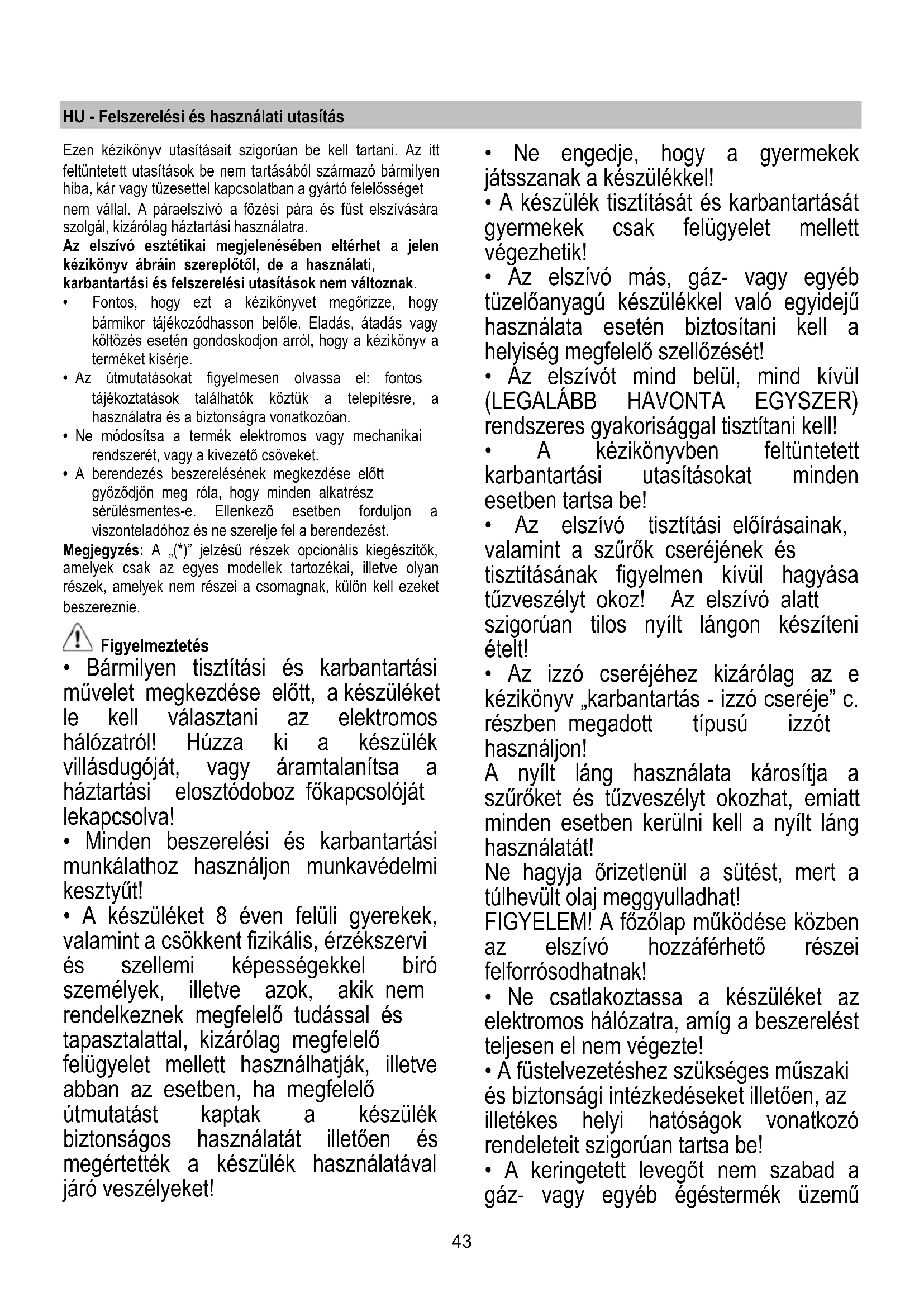 - Az elszívót SOHA ne használja tárolófelületként, hacsak az ilyen célra való használata nincs egyértelműen jelezve!
