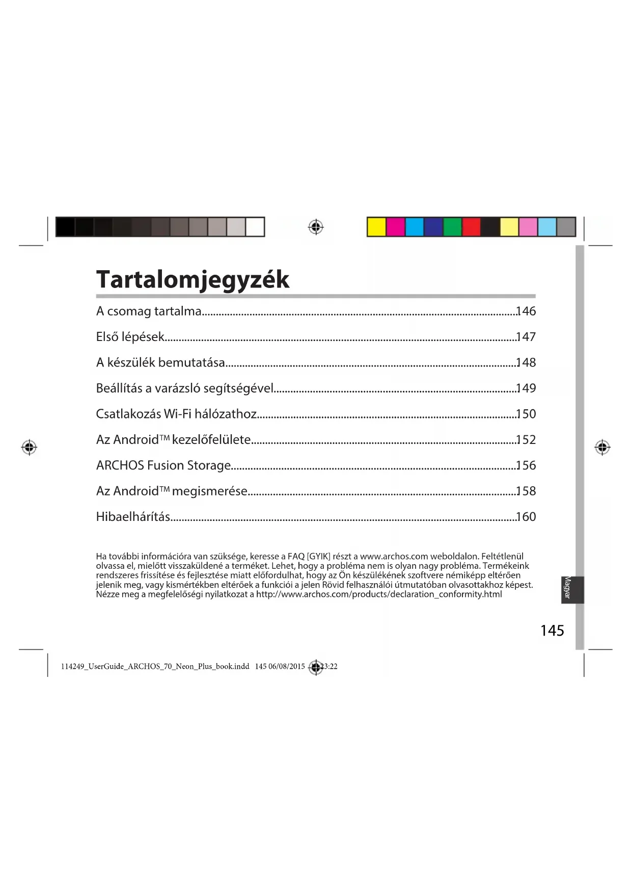 Jeśli chcesz wydłużyć żywotność baterii: Reguluj jasność ekranu wzależności od oświetlenia otoczenia iwyłączaj funkcje łączności bezprzewodowej, gdy znich nie korzystasz. Jeśli urządzenie działa zbyt wolno: Zamknij wszystkie otwarte aplikacje. Jeśli sygnał Wi-Fi jest zbyt słaby: Upewnij się, że nie znajdujesz się wzbyt dużej odległości od punktu dostępowego Wi-Fi. Zaktualizuj oprogramowanie wbudowane: http://www.archos.com/support. Zresetuj izmień parametry łączności. Skontaktuj się zdostawcą usług sieci Wi-Fi. 114249_UserGuide_ARCHOS_70_Neon_Plus_book.indd 144 06/08/2015 15:23:22145 Magyar Tartalomjegyzék Ha további információra van szüksége, keresse a FAQ [GYIK] részt a www.archos.com weboldalon. Feltétlenül olvassa el, mielőtt visszaküldené a terméket. Lehet, hogy a probléma nem is olyan nagy probléma. Termékeink rendszeres frissítése és fejlesztése miatt előfordulhat, hogy az Ön készülékének szoftvere némiképp eltérően jelenik meg, vagy kismértékben eltérőek a funkciói a jelen Rövid felhasználói útmutatóban olvasottakhoz képest. Nézze meg a megfelelőségi nyilatkozat a http://www.archos.com/products/declaration_conformity.html A csomag tartalma.................................................................................................................. Első lépések............................................................................................................................... A készülék bemutatása......................................................................................................... Beállítás a varázsló segítségével........................................................................................ Csatlakozás Wi-Fi hálózathoz.............................................................................................. Az Android