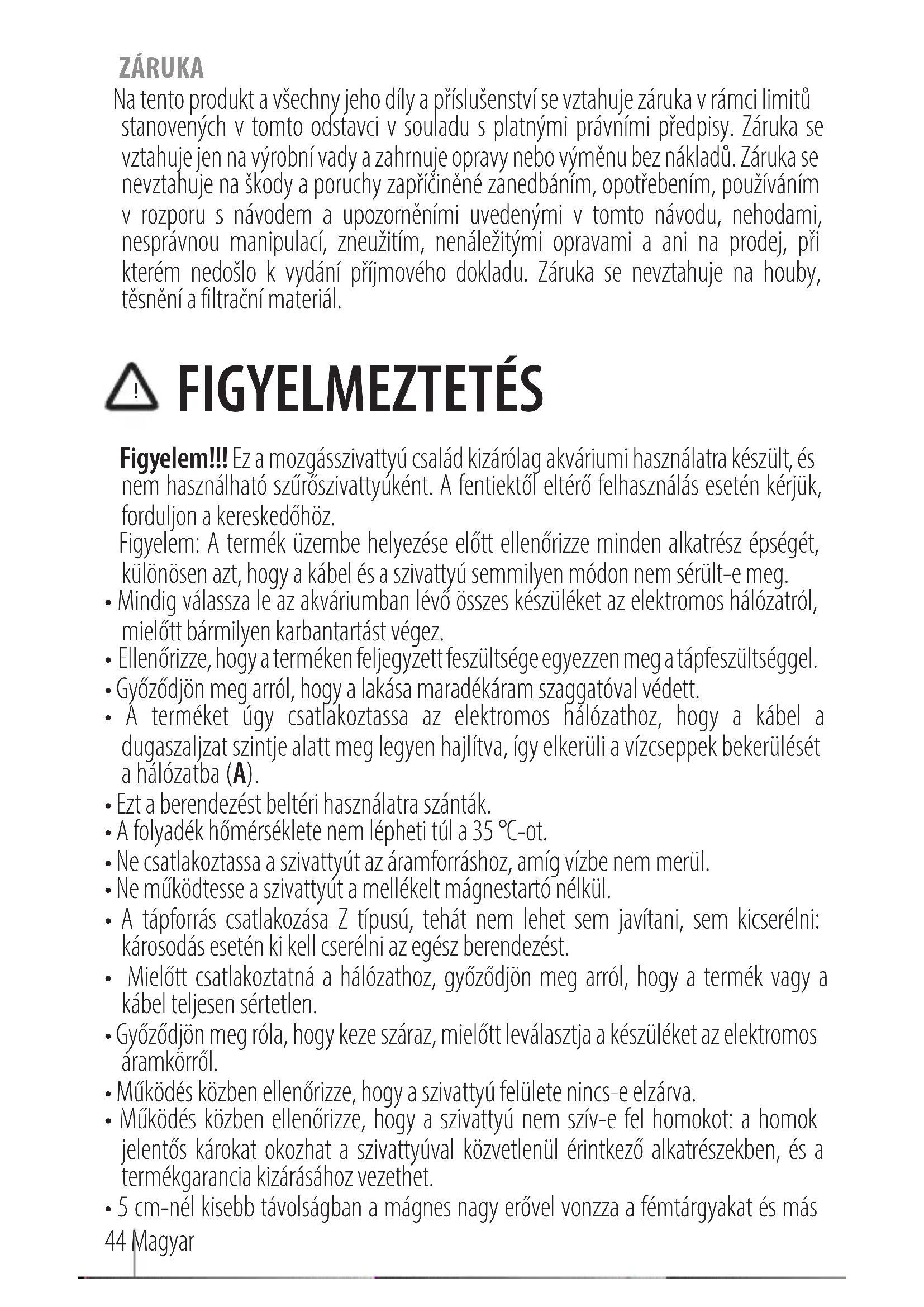 FIGYELMEZTETÉS Figyelem!!! Ez a mozgásszivattyú család kizárólag akváriumi használatra készült, és nem használható szűrőszivattyúként. A fentiektől eltérő felhasználás esetén kérjük, forduljon a kereskedőhöz. Figyelem: A termék üzembe helyezése előtt ellenőrizze minden alkatrész épségét, különösen azt, hogy a kábel és a szivattyú semmilyen módon nem sérült-e meg.