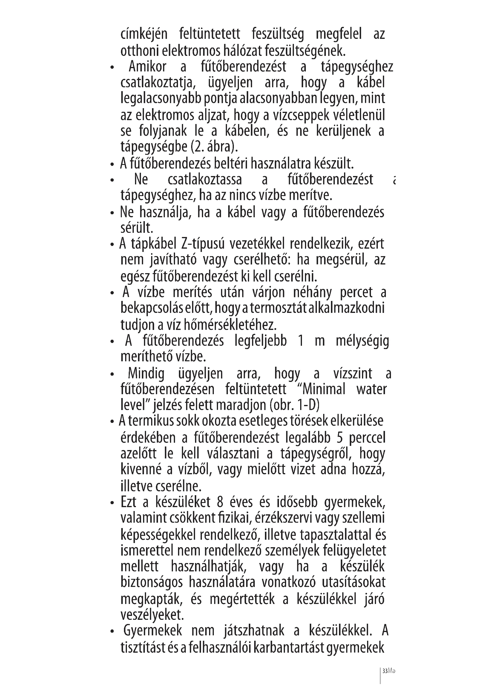 - Ne csatlakoztassa a fűtőberendezést a tápegységhez, ha az nincs vízbe merítve.