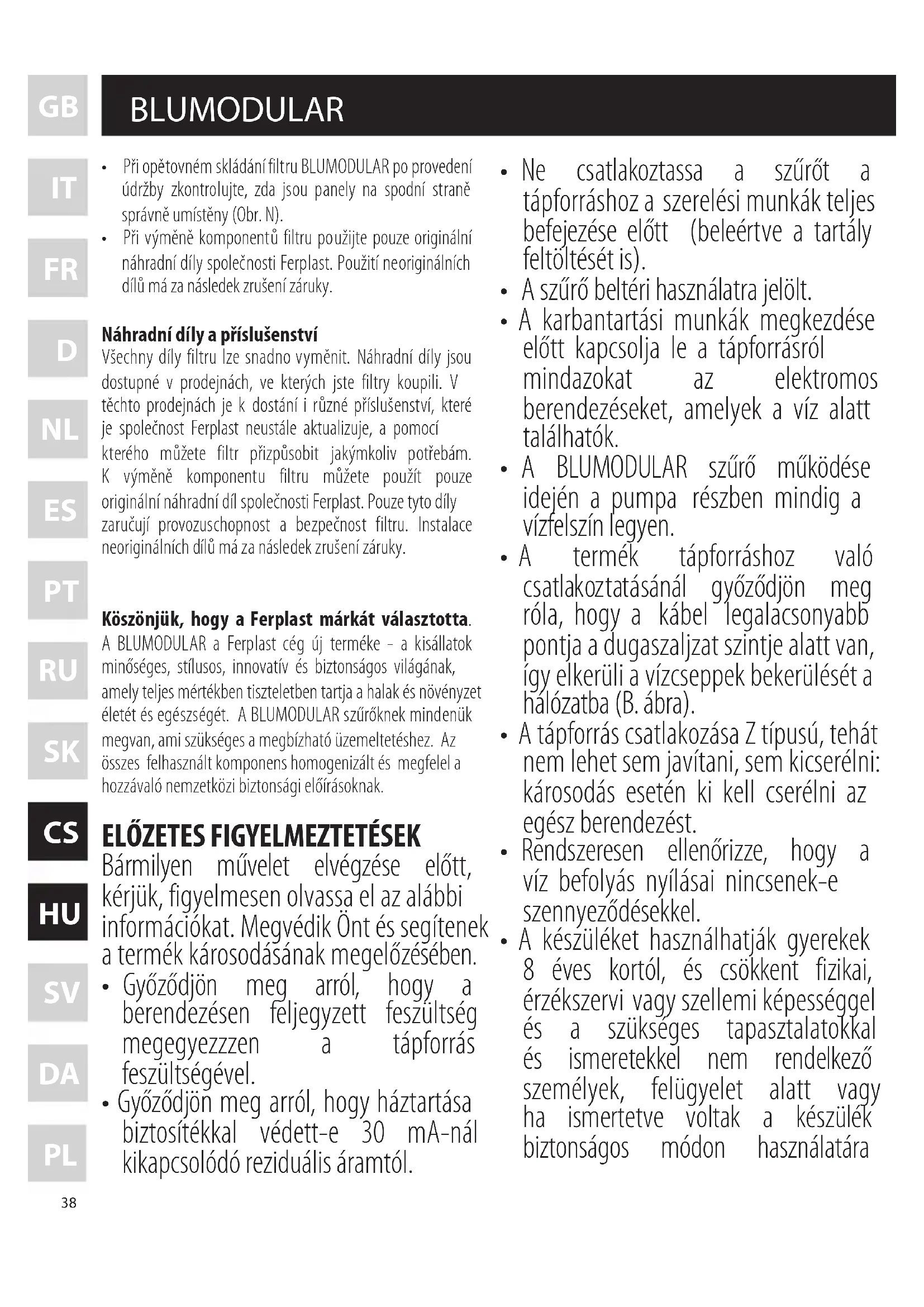 - A szűrő komponenseinek cseréjénél csak a Ferplast cég eredeti alkatrészeit használja. A nem eredeti pótalkatrészek használatával a garancia érvényét veszti. Pótalkatrészek és tartozékok A szűrő minden része könnyen cserélhető. A pótalkatrészek azokban a boltokban kaphatók, ahol a szűrőket vásárolta. Az ilyen boltokban a különböző tartozékok is találhatók, amelyek a Ferplast cég által folyamatosan aktualizálva vannak, és amelyek segítségével a szűrőt bármilyen szükségletekhez hozzá lehet igazítani. A szűrő alkotórészének cseréjéhez csak az eredeti Ferplast pótalkatrészt lehet használni. Csak ezek az alkatrészek garantálják a szűrő üzemképességét és biztonságát. A nem eredeti alkatrészek használatával a garancia érvényét veszti. Tack för att du väljer Ferplast. BLUMODULAR är en ny produkt från Ferplast, för en värld för små djur som är säker, modern, nytänkande och av högsta kvalitet och som fullständigt respekterar livet och hälsan hos fiskarna och växterna. BLUMODULAR filter har redan allt de behöver för att fungera korrekt. Varje komponent är typ- godkänd och anpassar sig efter de relevanta interationella säkerhetsföreskrifterna.