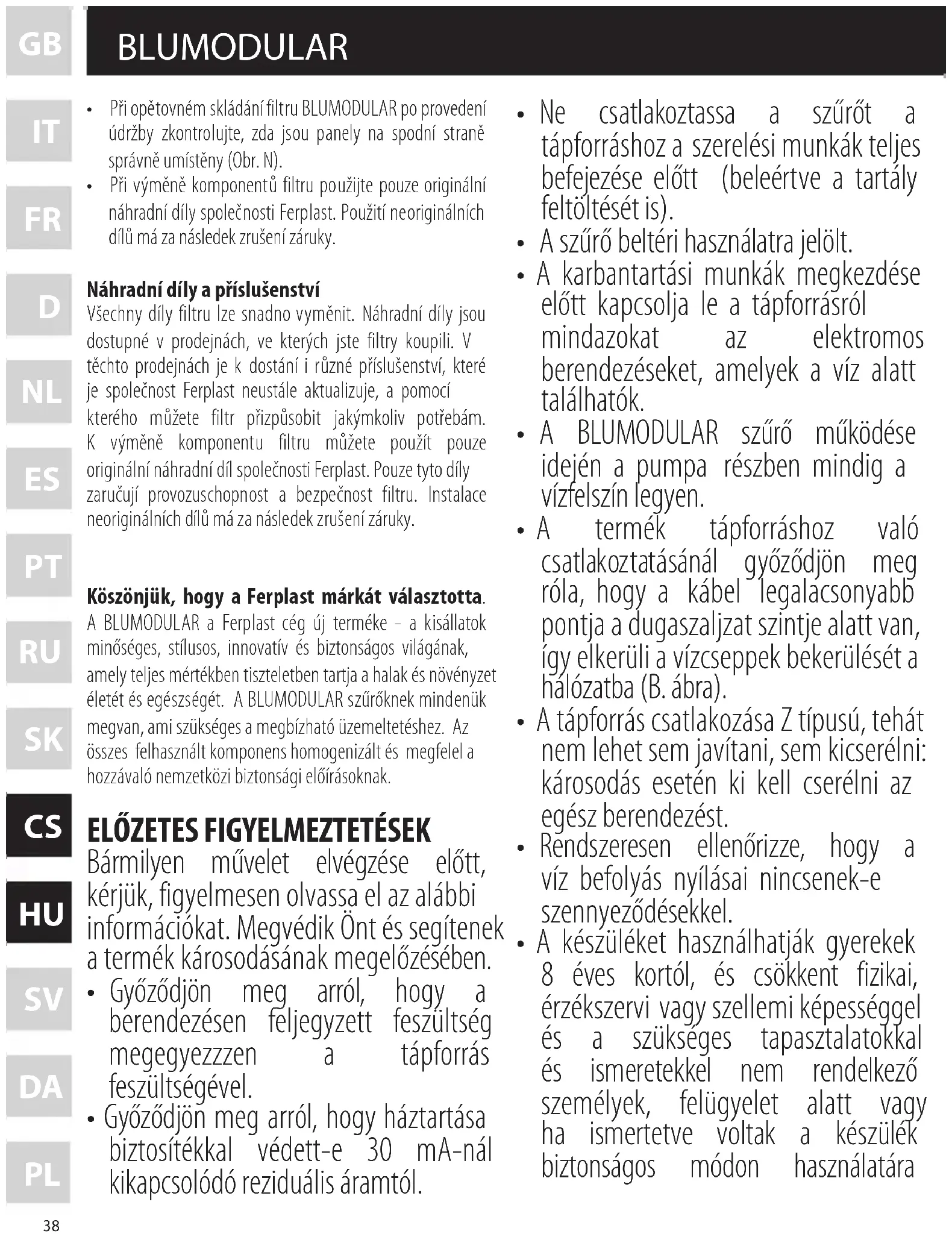 - A szűrő komponenseinek cseréjénél csak a Ferplast cég eredeti alkatrészeit használja. A nem eredeti pótalkatrészek használatával a garancia érvényét veszti. Pótalkatrészek és tartozékok A szűrő minden része könnyen cserélhető. A pótalkatrészek azokban a boltokban kaphatók, ahol a szűrőket vásárolta. Az ilyen boltokban a különböző tartozékok is találhatók, amelyek a Ferplast cég által folyamatosan aktualizálva vannak, és amelyek segítségével a szűrőt bármilyen szükségletekhez hozzá lehet igazítani. A szűrő alkotórészének cseréjéhez csak az eredeti Ferplast pótalkatrészt lehet használni. Csak ezek az alkatrészek garantálják a szűrő üzemképességét és biztonságát. A nem eredeti alkatrészek használatával a garancia érvényét veszti. Tack för att du väljer Ferplast. BLUMODULAR är en ny produkt från Ferplast, för en värld för små djur som är säker, modern, nytänkande och av högsta kvalitet och som fullständigt respekterar livet och hälsan hos fiskarna och växterna. BLUMODULAR filter har redan allt de behöver för att fungera korrekt. Varje komponent är typ- godkänd och anpassar sig efter de relevanta interationella säkerhetsföreskrifterna.