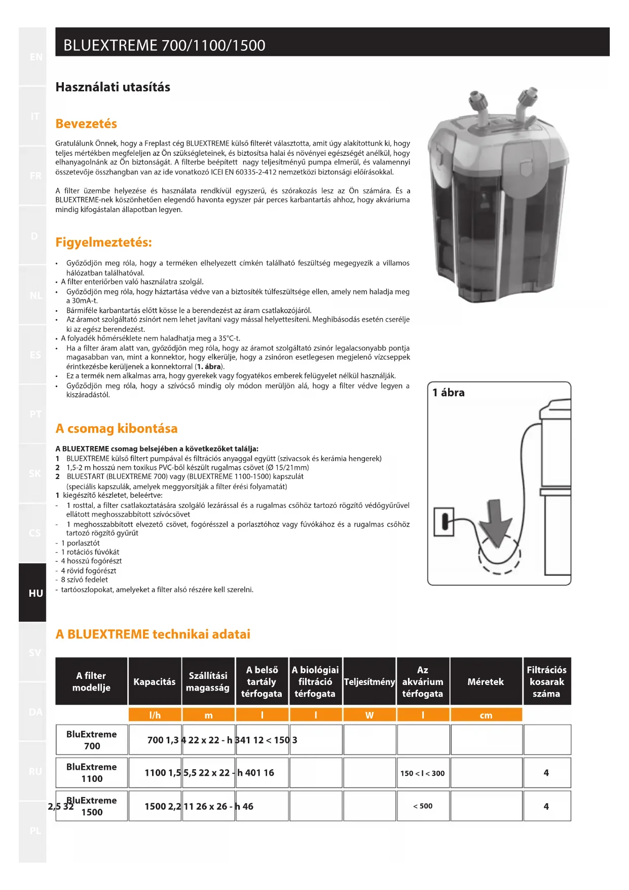 Használati utasítás Bevezetés Gratulálunk Önnek, hogy a Freplast cég BLUEXTREME külső filterét választotta, amit úgy alakítottunk ki, hogy teljes mértékben megfeleljen az Ön szükségleteinek, és biztosítsa halai és növényei egészségét anélkül, hogy elhanyagolnánk az Ön biztonságát. A filterbe beépített nagy teljesítményű pumpa elmerül, és valamennyi összetevője összhangban van az ide vonatkozó ICEI EN 60335-2-412 nemzetközi biztonsági előírásokkal.A filter üzembe helyezése és használata rendkívül egyszerű, és szórakozás lesz az Ön számára. És a BLUEXTREME-nek köszönhetően elegendő havonta egyszer pár perces karbantartás ahhoz, hogy akváriuma mindig kifogástalan állapotban legyen. Figyelmeztetés: