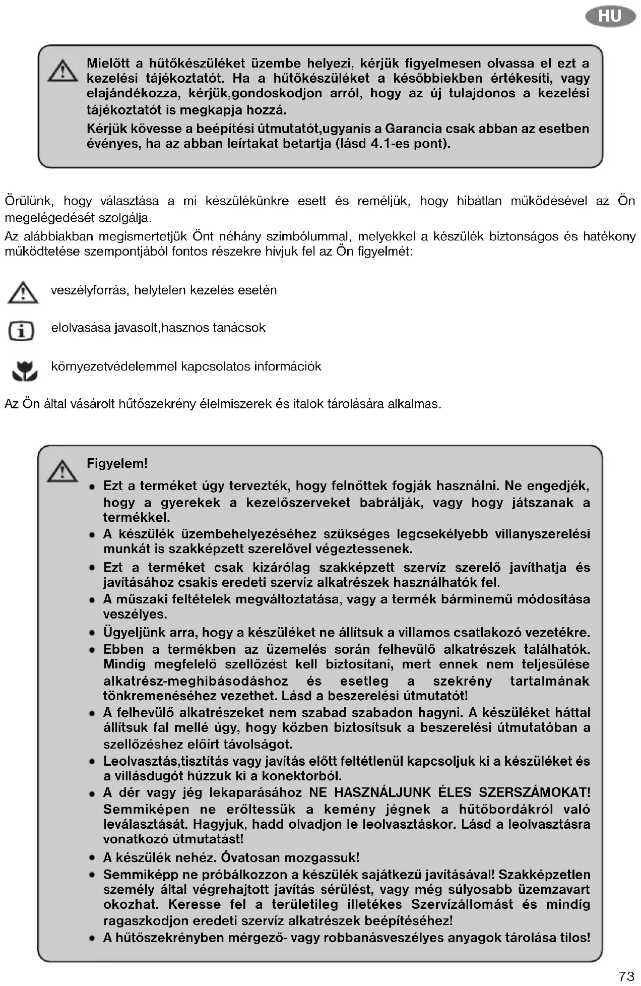 Örülünk, hogy választása a mi készülékünkre esett és reméljük, hogy hibátlan működésével az Ön megelégedését szolgálja. Az alábbiakban megismertetjük Önt néhány szimbólummal, melyekkel a készülék biztonságos és hatékony működtetése szempontjából fontos részekre hívjuk fel az Ön figyelmét: veszélyforrás, helytelen kezelés esetén elolvasása javasolt,hasznos tanácsok környezetvédelemmel kapcsolatos információk Az Ön által vásárolt hűtőszekrény élelmiszerek és italok tárolására alkalmas. Figyelem! Ezt a terméket úgy tervezték, hogy felnőttek fogják használni. Ne engedjék, hogy a gyerekek a kezelőszerveket babrálják, vagy hogy játszanak a termékkel. A készülék üzembehelyezéséhez szükséges legcsekélyebb villanyszerelési munkát is szakképzett szerelővel végeztessenek. Ezt a terméket csak kizárólag szakképzett szervíz szerelő javíthatja és javításához csakis eredeti szervíz alkatrészek használhatók fel. A műszaki feltételek megváltoztatása, vagy a termék bárminemű módosítása veszélyes. Ügyeljünk arra, hogy a készüléket ne állítsuk a villamos csatlakozó vezetékre. Ebben a termékben az üzemelés során felhevülő alkatrészek találhatók. Mindíg megfelelő szellőzést kell biztosítani, mert ennek nem teljesülése alkatrész-meghibásodáshoz és esetleg a szekrény tartalmának tönkremenéséhez vezethet. Lásd a beszerelési útmutatót! A felhevülő alkatrészeket nem szabad szabadon hagyni. A készüléket háttal állítsuk fal mellé úgy, hogy közben biztosítsuk a beszerelési útmutatóban a szellőzéshez előírt távolságot. Leolvasztás,tisztítás vagy javítás előtt feltétlenül kapcsoljuk ki a készüléket és a villásdugót húzzuk ki a konektorból. A dér vagy jég lekaparásához NE HASZNÁLJUNK ÉLES SZERSZÁMOKAT! Semmiképen ne erőltessük a kemény jégnek a hűtőbordákról való leválasztását. Hagyjuk, hadd olvadjon le leolvasztáskor. Lásd a leolvasztásra vonatkozó útmutatást! A készülék nehéz. Óvatosan mozgassuk! Semmiképp ne próbálkozzon a készülék sajátkezű javításával! Szakképzetlen személy által végrehajtott javítás sérülést, vagy még súlyosabb üzemzavart okozhat. Keresse fel a területileg illetékes Szervízállomást és mindíg ragaszkodjon eredeti szervíz alkatrészek beépítéséhez! A hűtőszekrényben mérgező- vagy robbanásveszélyes anyagok tárolása tilos! Mielőtt a hűtőkészüléket üzembe helyezi, kérjük figyelmesen olvassa el ezt a kezelési tájékoztatót. Ha a hűtőkészüléket a későbbiekben értékesíti, vagy elajándékozza, kérjük,gondoskodjon arról, hogy az új tulajdonos a kezelési tájékoztatót is megkapja hozzá. Kérjük kövesse a beépítési útmutatót,ugyanis a Garancia csak abban az esetben évényes, ha az abban leírtakat betartja (lásd 4.1-es pont).74 TARTALOMJEGYZÉK