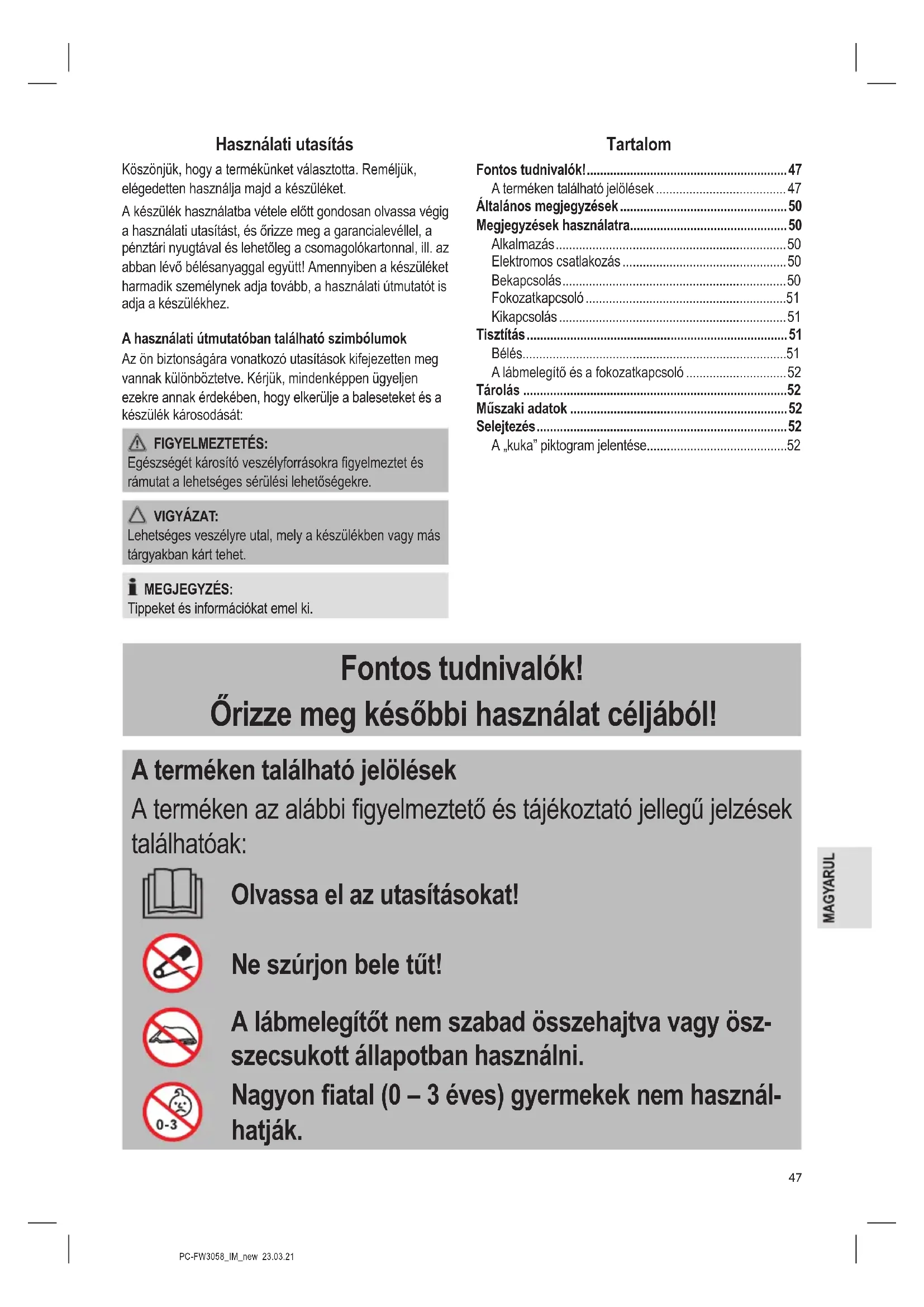 - A „kuka” piktogram jelentése Fontos tudnivalók! Őrizze meg későbbi használat céljából! A terméken található jelölések A terméken az alábbi gyelmeztető és tájékoztató jellegű jelzések találhatóak: Olvassa el az utasításokat! Ne szúrjon bele tűt! A lábmelegítőt nem szabad összehajtva vagy ösz- szecsukott állapotban használni. Nagyon atal (0 – 3 éves) gyermekek nem használ- hatják.PC-FW3058_IM_new 23.03.21 p. 52
