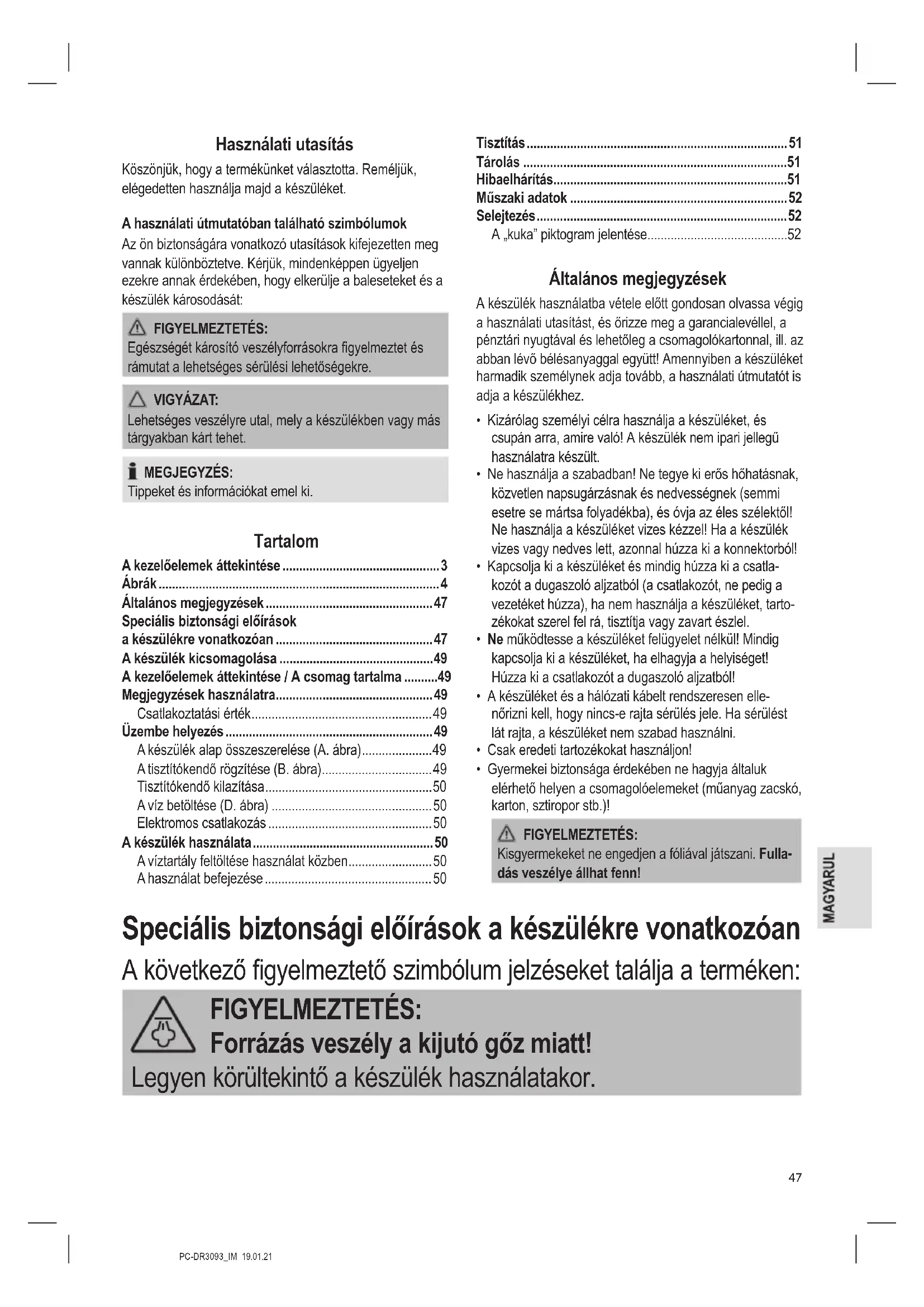 - Gyermekei biztonsága érdekében ne hagyja általuk elérhető helyen a csomagolóelemeket (műanyag zacskó, karton, sztiropor stb.)! FIGYELMEZTETÉS: Kisgyermekeket ne engedjen a fóliával játszani. Fulla- dás veszélye állhat fenn! Speciális biztonsági előírások a készülékre vonatkozóan A következő gyelmeztető szimbólum jelzéseket találja a terméken: FIGYELMEZTETÉS: Forrázás veszély a kijutó gőz miatt! Legyen körültekintő a készülék használatakor.PC-DR3093_IM 19.01.21