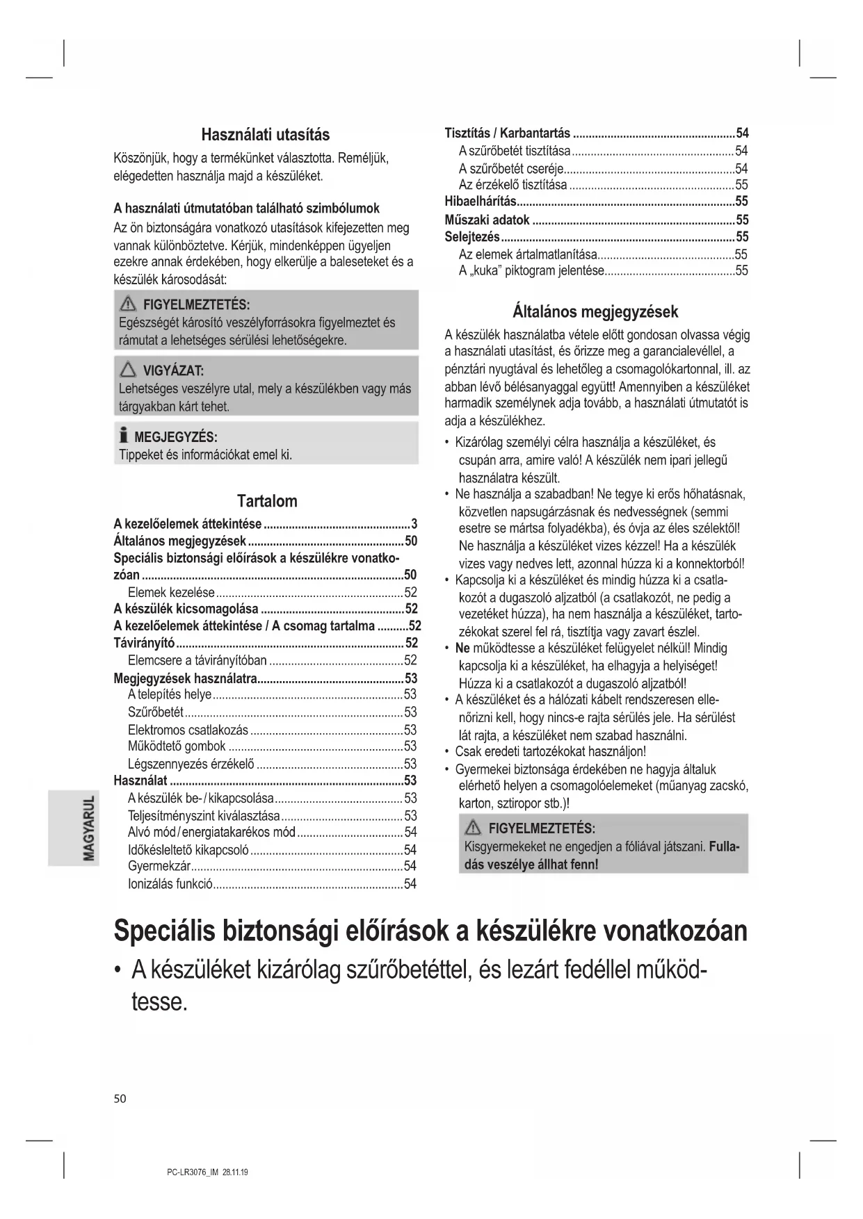 - A készüléket 8 éves és idősebb gyerekek és csökkent zikai, érzékszervi vagy értelmi képességű személyek és akiknek nincs meg a tapasztalatuk és tudásuk ehhez, csak akkor használhatják, ha felügyelet alatt állnak vagy a készülék biztonságos használa- tára megtanították őket és megértették az érintett veszélyeket.PC-LR3076_IM 28.11.19