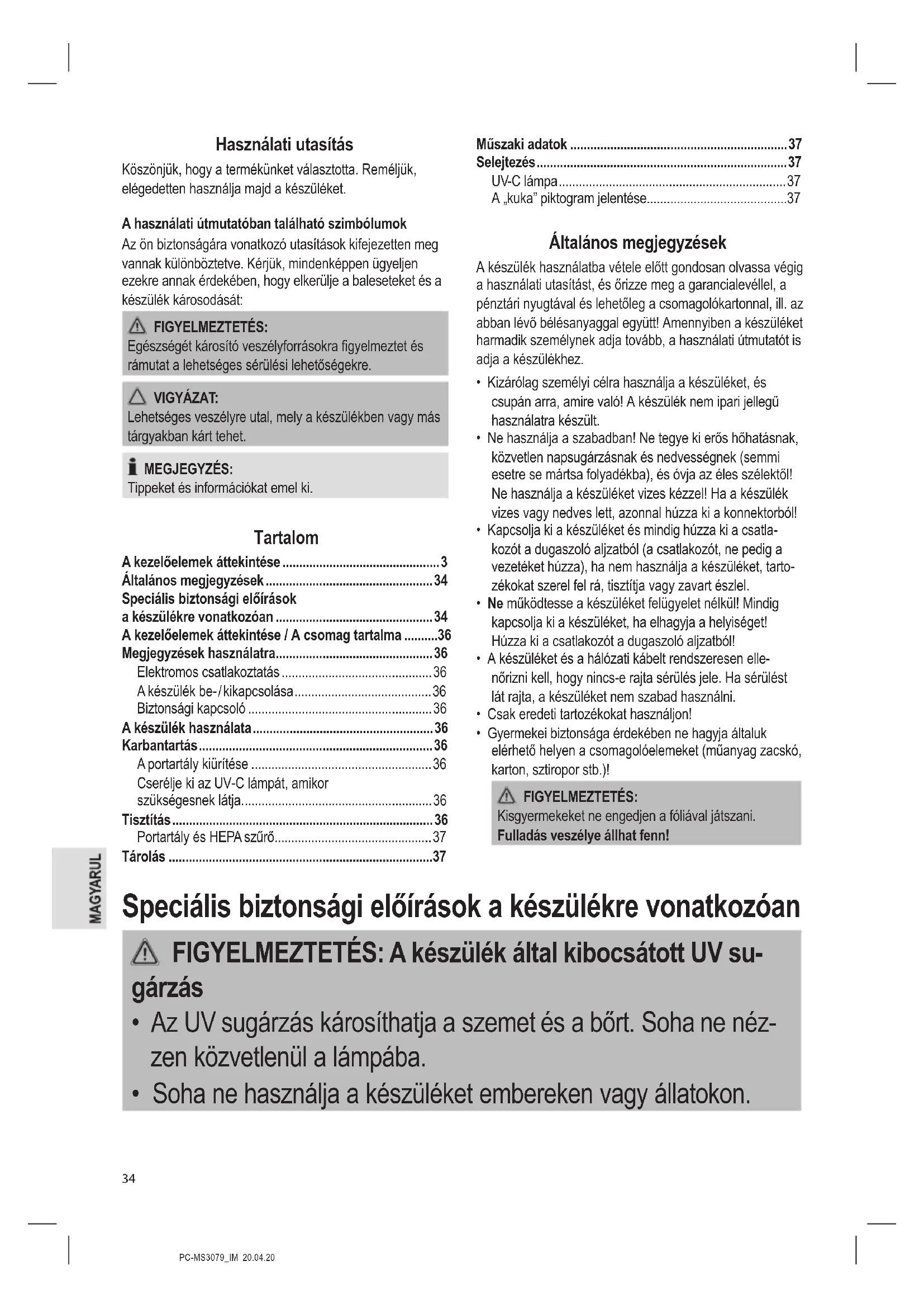 - A készüléket semmiképpen ne merítse vízbe tisztítás közben. Ez elektromos áramütést vagy tüzet okozhat.PC-MS3079_IM 20.04.20