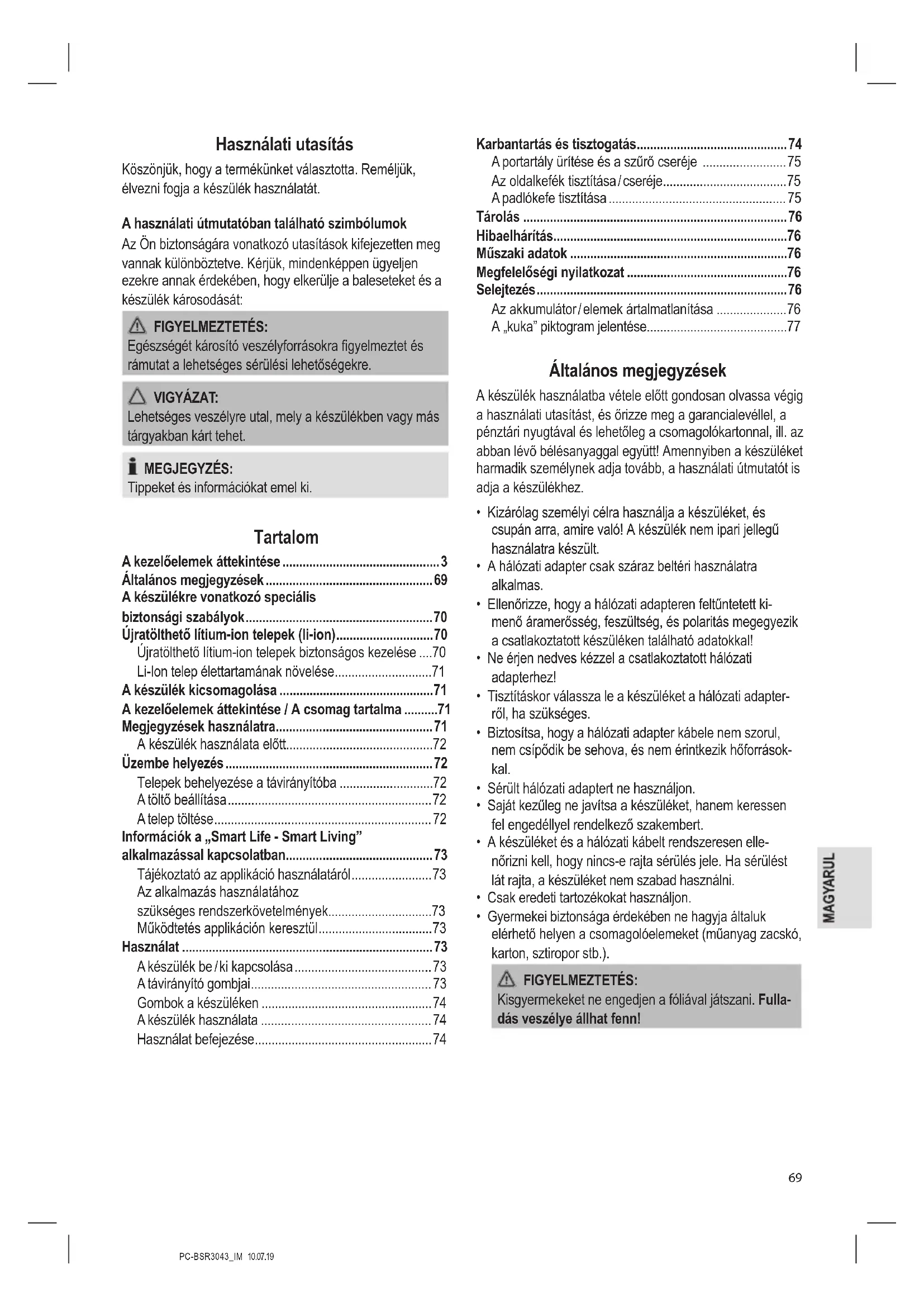 - Gyermekei biztonsága érdekében ne hagyja általuk elérhető helyen a csomagolóelemeket (műanyag zacskó, karton, sztiropor stb.). FIGYELMEZTETÉS: Kisgyermekeket ne engedjen a fóliával játszani. Fulla- dás veszélye állhat fenn!PC-BSR3043_IM 10.07.19