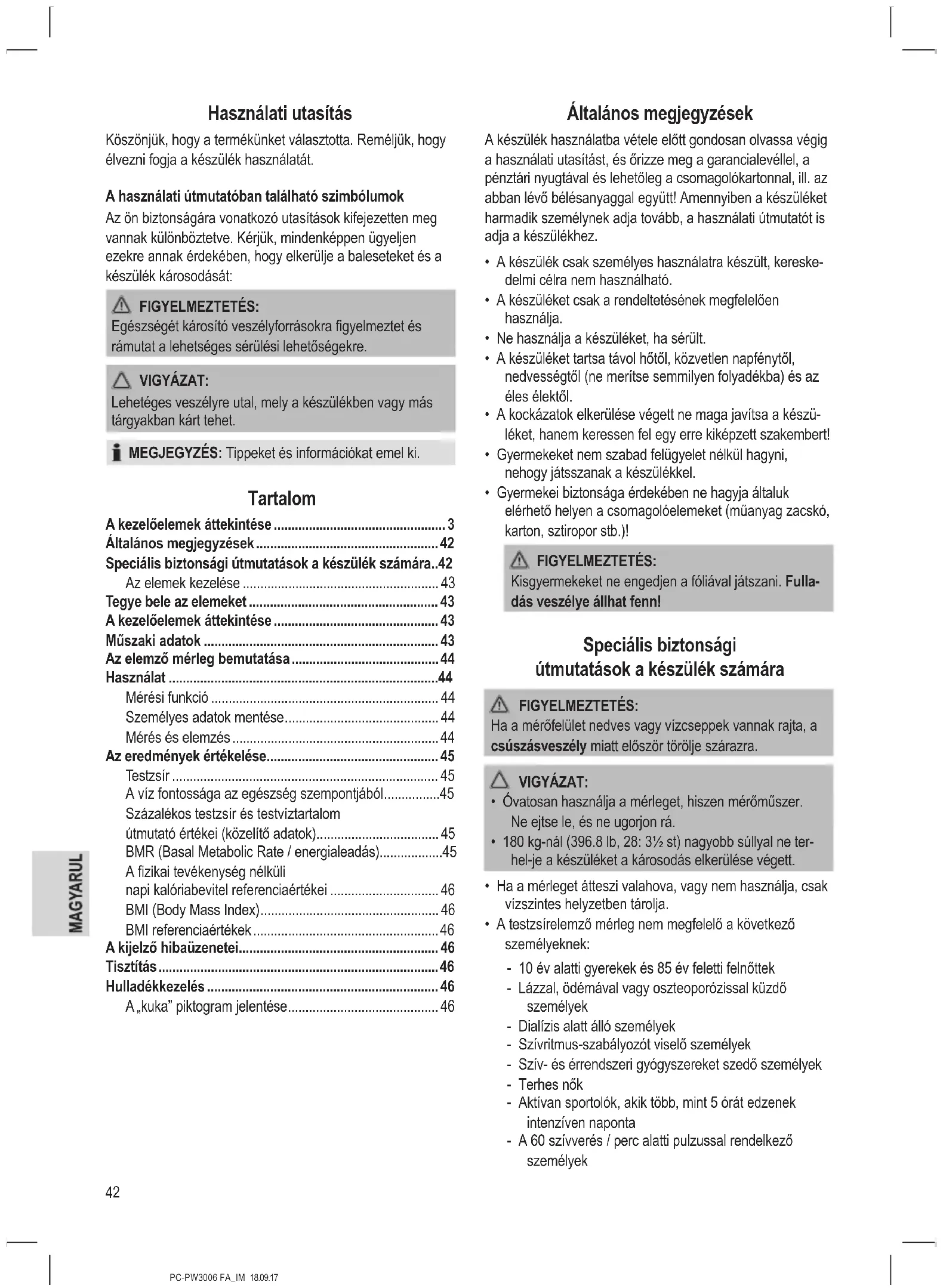 - A testsúlyunk többek között testzsírból, testvízből, izomtömegből és csonttömegből tevődik össze. A kapott értékek az egyes összetevőkön belül az egyéni vízvisz- szatartástól függően változók lehetnek. Ez normális, és nagyban függ a táplálkozástól és az életmódtól.45 PC-PW3006 FA_IM 18.09.17