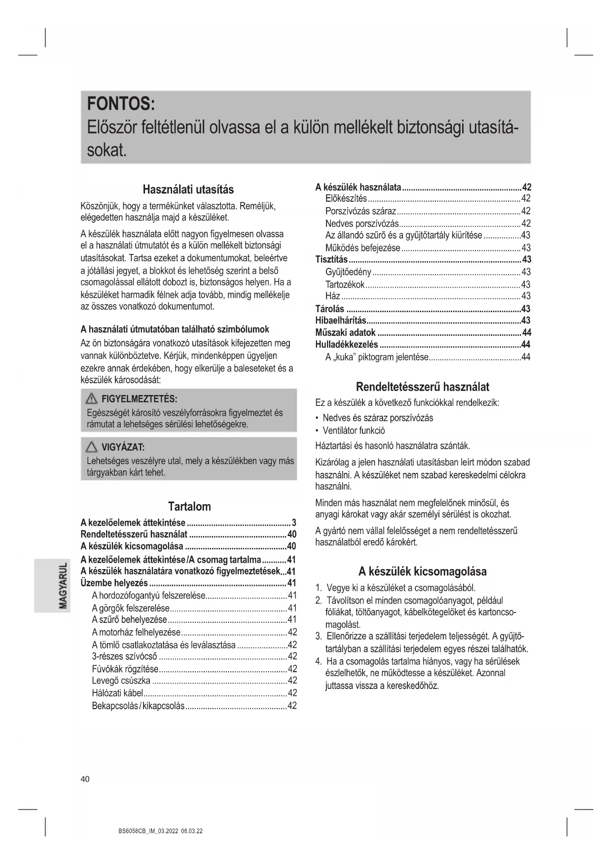 - Rendeltetésszerű használat p. 40