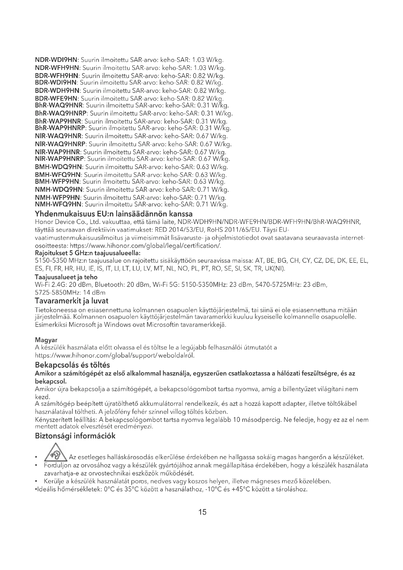 terméket es az akkumuláort a helyi hatósagok által kijelölt külön hulladékgyüjto pontokra kell vinni az elettartamuk vegén. Ez biztosítja az EEE hulladékok ujrahasznosithatósagát es kezelését oylan modon, hogy az értékes anyagaik megörizhetók legyenek, és azoktól az embari egészég és a környezet megóvható legyen. Bóvebb informácior térkjuk, vegye fel a kapcsolatot a helyi hatósagokkal, a viszonteladoval vagy a háztartásihulladékot kezeló szolgaltatóval, illetve latogasson el a https://www.hihonor.com/weboldalra.