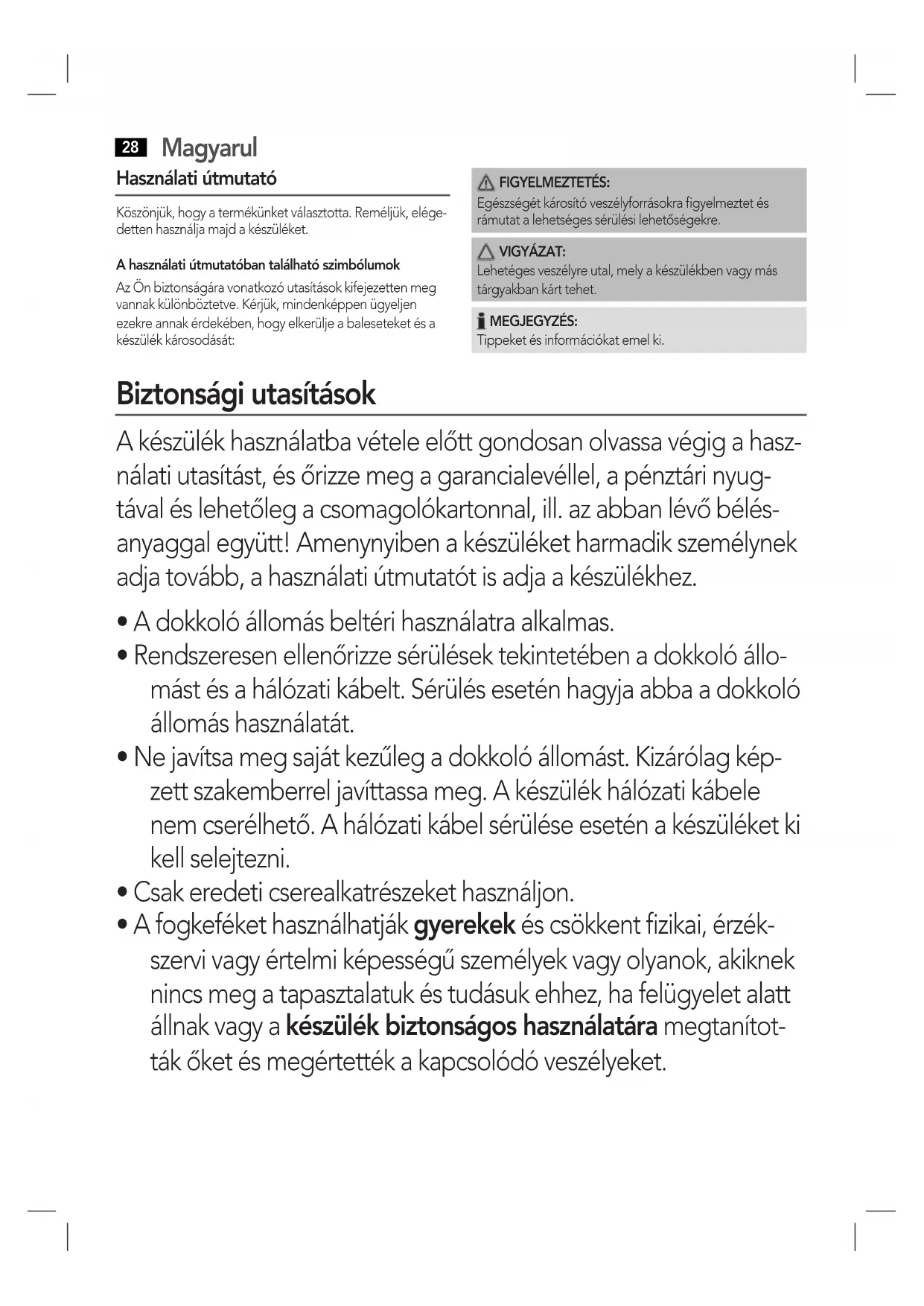 Használati útmutató Köszönjük, hogy a termékünket választotta. Reméljük, elége-detten használja majd a készüléket.A használati útmutatóban található szimbólumokAz Ön biztonságára vonatkozó utasítások kifejezetten meg vannak különböztetve. Kérjük, mindenképpen ügyeljen ezekre annak érdekében, hogy elkerülje a baleseteket és a készülék károsodását: FIGYELMEZTETÉS:Egészségét károsító veszélyforrásokra figyelmeztet és rámutat a lehetséges sérülési lehetőségekre. VIGYÁZAT: Lehetéges veszélyre utal, mely a készülékben vagy más tárgyakban kárt tehet. MEGJEGYZÉS:Tippeket és információkat emel ki. Biztonsági utasítások A készülék használatba vétele előtt gondosan olvassa végig a hasz- nálati utasítást, és őrizze meg a garancialevéllel, a pénztári nyug- tával és lehetőleg a csomagolókartonnal, ill. az abban lévő bélés- anyaggal együtt! Amenynyiben a készüléket harmadik személynek adja tovább, a használati útmutatót is adja a készülékhez.