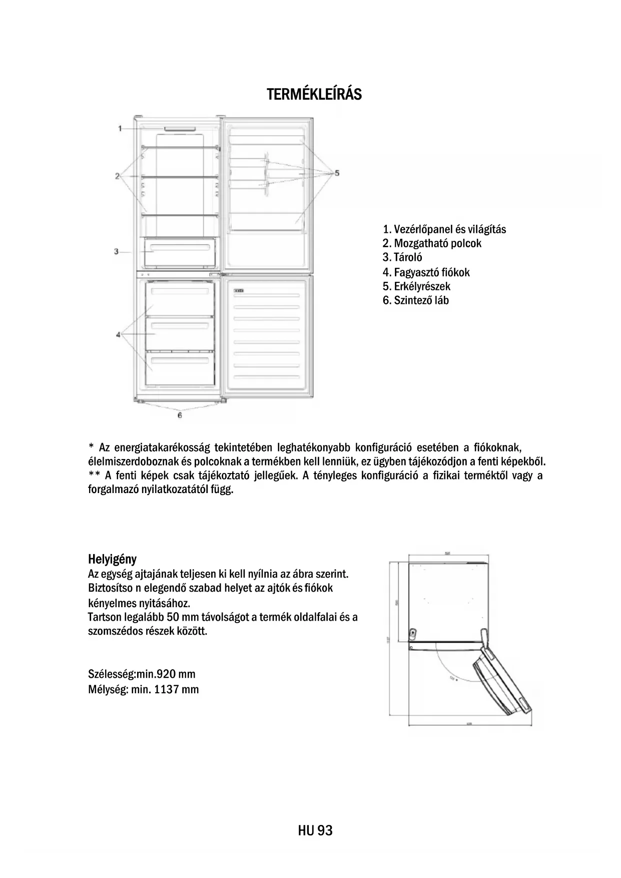 - Az energiatakarékosság tekintetében leghatékonyabb konfiguráció esetében a fiókoknak, élelmiszerdoboznak és polcoknak a termékben kell lenniük, ez ügyben tájékozódjon a fenti képekből. ** A fenti képek csak tájékoztató jellegűek. A tényleges konfiguráció a fizikai terméktől vagy a forgalmazó nyilatkozatától függ. Helyigény Az egység ajtajának teljesen ki kell nyílnia az ábra szerint. Biztosítso n elegendő szabad helyet az ajtók és fiókok kényelmes nyitásához. Tartson legalább 50 mm távolságot a termék oldalfalai és a szomszédos részek között. Szélesség:min.920 mm Mélység: min. 1137 mmHU 94 HASZNÁLAT ➀ BE/KI gomb, amely a készülék be- és kikapcsolására szolgál. ➁ Mode gomb, amely a hűtőszekrény hőmérsékletének vagy speciális funkciók kiválasztására szolgál. ➂ Wi-Fi ikon, amely a készülék alkalmazáshoz való csatlakozásáról tájékoztat. ➃ Super Cool ikon, amely megerősíti a funkció bekapcsolt állapotát. ➄ Hőmérsékleti szintek, amelyek visszajelzéssel szolgálnak a kiválasztott hőmérsékletről. Használat