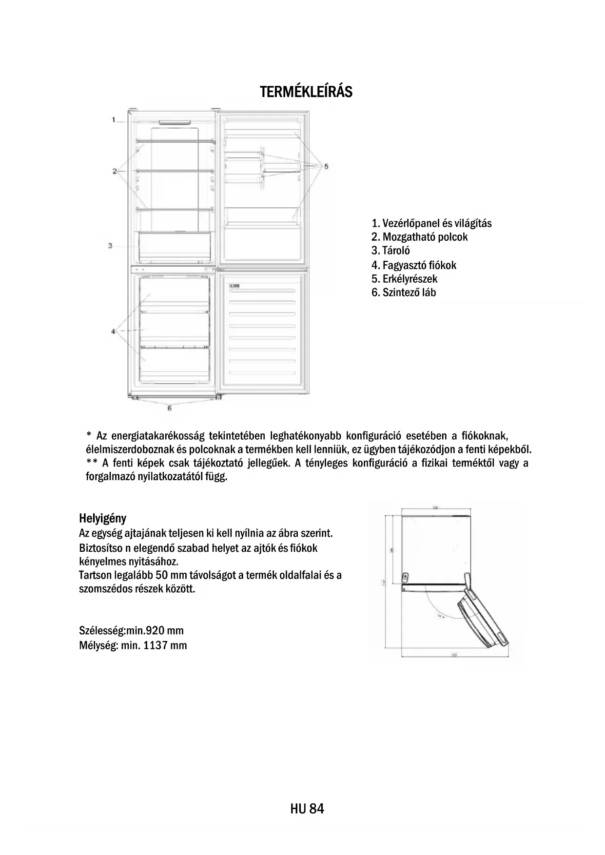 - Az energiatakarékosság tekintetében leghatékonyabb konfiguráció esetében a fiókoknak, élelmiszerdoboznak és polcoknak a termékben kell lenniük, ez ügyben tájékozódjon a fenti képekből. ** A fenti képek csak tájékoztató jellegűek. A tényleges konfiguráció a fizikai terméktől vagy a forgalmazó nyilatkozatától függ. Helyigény Az egység ajtajának teljesen ki kell nyílnia az ábra szerint. Biztosítso n elegendő szabad helyet az ajtók és fiókok kényelmes nyitásához. Tartson legalább 50 mm távolságot a termék oldalfalai és a szomszédos részek között. Szélesség:min.920 mm Mélység: min. 1137 mmHU 85 HASZNÁLAT ➀ BE/KI gomb, amely a készülék be- és kikapcsolására szolgál. ➁ SET gomb, amely a hűtőszekrény hőmérsékletének vagy speciális funkciók kiválasztására szolgál. ➂ Wi-Fi ikon, amely a készülék alkalmazáshoz való csatlakozásáról tájékoztat. ➃ Super Cool ikon, amely megerősíti a funkció bekapcsolt állapotát. ➄ Hőmérsékleti szintek, amelyek visszajelzéssel szolgálnak a kiválasztott hőmérsékletről. Használat