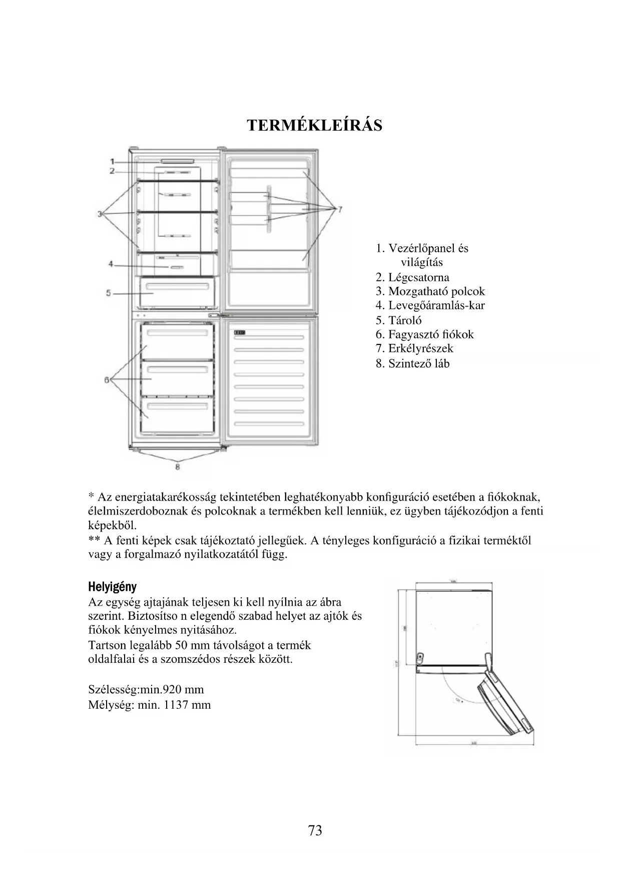 - Az energiatakarékosság tekintetében leghatékonyabb konfiguráció esetében a fiókoknak, élelmiszerdoboznak és polcoknak a termékben kell lenniük, ez ügyben tájékozódjon a fenti képekből. ** A fenti képek csak tájékoztató jellegűek. A tényleges konfiguráció a fizikai terméktől vagy a forgalmazó nyilatkozatától függ. Helyigény Az egység ajtajának teljesen ki kell nyílnia az ábra szerint. Biztosítso n elegendő szabad helyet az ajtók és fiókok kényelmes nyitásához. Tartson legalább 50 mm távolságot a termék oldalfalai és a szomszédos részek között. Szélesség:min.920 mm Mélység: min. 1137 mm74 Használat