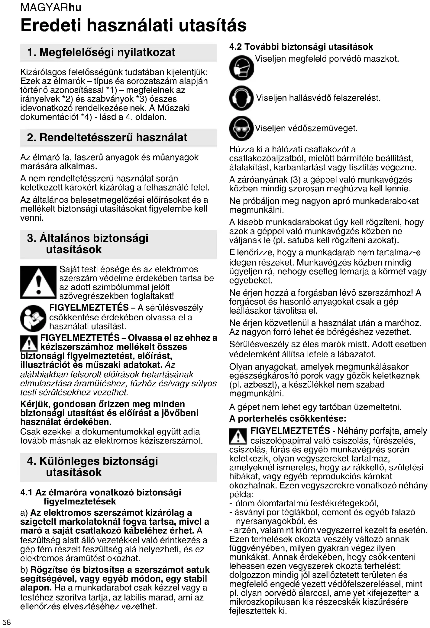 Eredeti használati utasítás Kizárólagos felelősségünk tudatában kijelentjük: Ezek az élmarók – típus és sorozatszám alapján történő azonosítással *1) – megfelelnek az irányelvek *2) és szabványok *3) összes idevonatkozó rendelkezéseinek. A Műszaki dokumentációt *4) - lásd a 4. oldalon. Az élmaró fa, faszerű anyagok és műanyagok marására alkalmas. A nem rendeltetésszerű használat során keletkezett károkért kizárólag a felhasználó felel. Az általános balesetmegelőzési előírásokat és a mellékelt biztonsági utasításokat figyelembe kell venni. Saját testi épsége és az elektromos szerszám védelme érdekében tartsa be az adott szimbólummal jelölt szövegrészekben foglaltakat! FIGYELMEZTETÉS – A sérülésveszély csökkentése érdekében olvassa el a használati utasítást. FIGYELMEZTETÉS – Olvassa el az ehhez a kéziszerszámhoz mellékelt összes biztonsági figyelmeztetést, előírást, illusztrációt és műszaki adatokat. Az alábbiakban felsorolt előírások betartásának elmulasztása áramütéshez, tűzhöz és/vagy súlyos testi sérülésekhez vezethet. Kérjük, gondosan őrizzen meg minden biztonsági utasítást és előírást a jövőbeni használat érdekében. Csak ezekkel a dokumentumokkal együtt adja tovább másnak az elektromos kéziszerszámot.