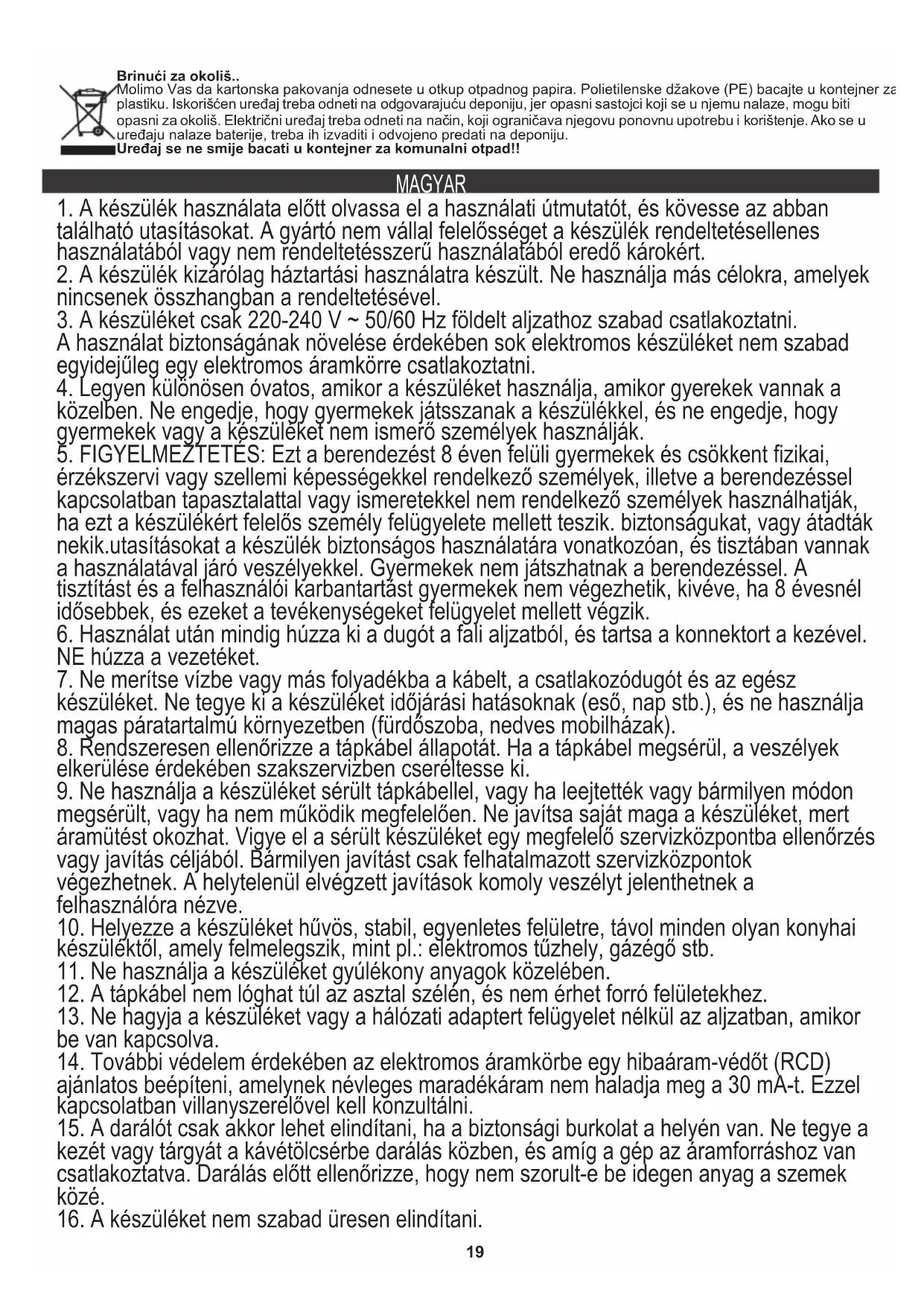 15. A darálót csak akkor lehet elindítani, ha a biztonsági burkolat a helyén van. Ne tegye a
