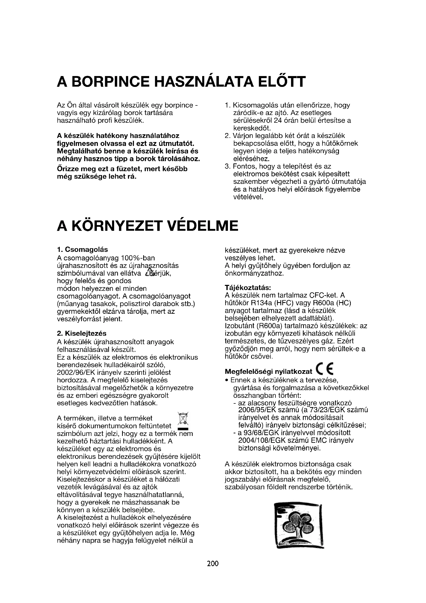 A készülék újrahasznosított anyagok felhasználásával készült. Ez a készülék az elektromos és elektronikus berendezések hulladékairól szóló, 2002/96/EK irányelv szerinti jelölést hordozza. A megfelelő kiselejtezés biztosításával megelőzhetők a környezetre és az emberi egészségre gyakorolt esetleges kedvezőtlen hatások. A terméken, illetve a terméket kísérő dokumentumokon feltüntetet szimbólum azt jelzi, hogy ez a termék nem kezelhető háztartási hulladékként. A készüléket egy az elektromos és elektronikus berendezések gyűjtésére kijelölt helyen kell leadni a hulladékokra vonatkozó helyi környezetvédelmi előírások szerint. Kiselejtezéskor a készüléket a hálózati vezeték levágásával és az ajtók eltávolításával tegye használhatatlanná, hogy a gyerekek ne mászhassanak be könnyen a készülék belsejébe. A kiselejtezést a hulladékok elhelyezésére vonatkozó helyi előírások szerint végezze és a készüléket egy gyűjtőhelyen adja le. Még néhány napra se hagyja felügyelet nélkül a készüléket, mert az gyerekekre nézve veszélyes lehet. A helyi gyűjtőhely ügyében forduljon az önkormányzathoz. Tájékoztatás: A készülék nem tartalmaz CFC-ket. A hűtőkör R134a (HFC) vagy R600a (HC) anyagot tartalmaz (lásd a készülék belsejében elhelyezett adattáblát). Izobutánt (R600a) tartalmazó készülékek: az izobután egy környezeti kihatások nélküli természetes, de tűzveszélyes gáz. Ezért győződjön meg arról, hogy nem sérültek-e a hűtőkör csövei. Megfelelőségi nyilatkozat