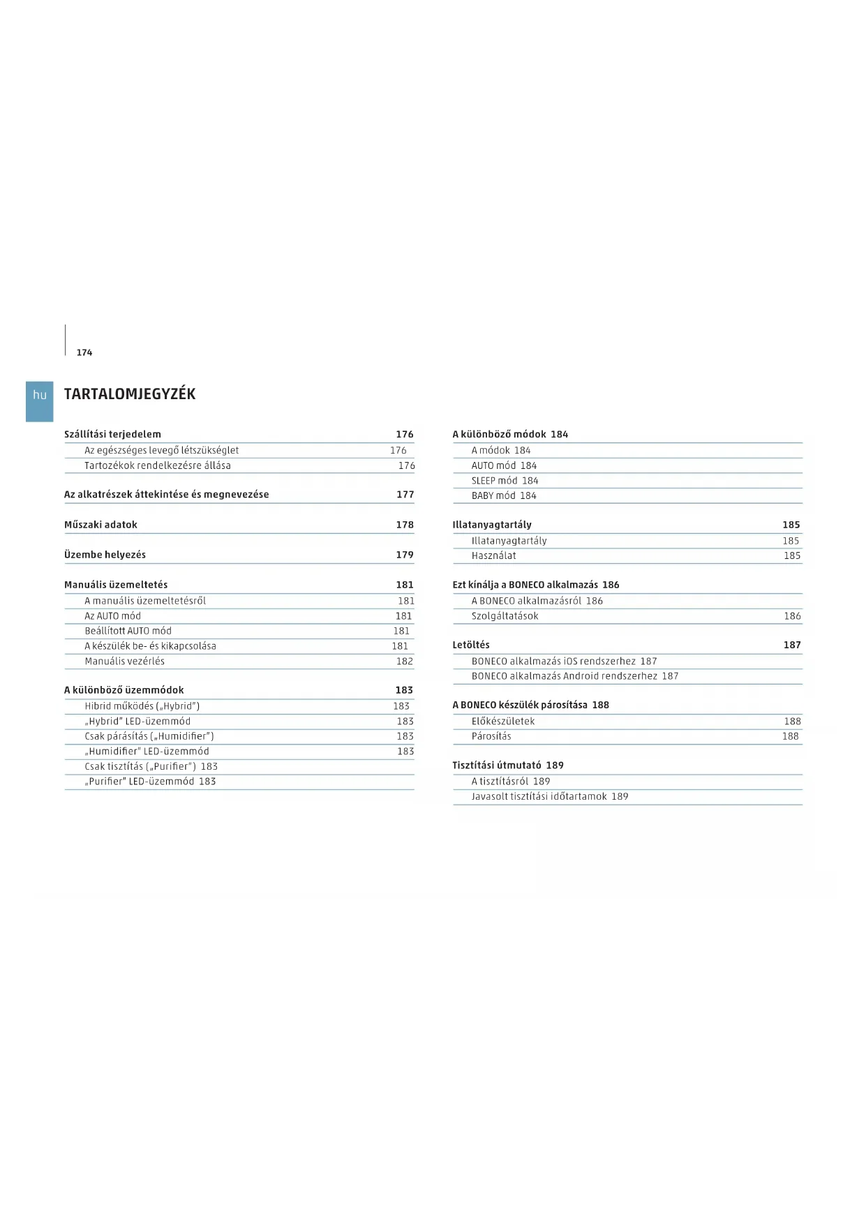 TARTALOMJEGYZÉK A különböző módok 184 A módok 184 AUTO mód 184 SLEEP mód 184 BABY mód 184 Illatanyagtartály 185 Illatanyagtartály 185 Használat 185 Ezt kínálja a BONECO alkalmazás 186 A BONECO alkalmazásról 186 Szolgáltatások 186 Letöltés 187 BONECO alkalmazás iOS rendszerhez 187 BONECO alkalmazás Android rendszerhez 187 A BONECO készülék párosítása 188 Előkészületek 188 Párosítás 188 Tisztítási útmutató 189 A tisztításról 189 Javasolt tisztítási időtartamok 189 Szállítási terjedelem 176 Az egészséges levegő létszükséglet 176 Tartozékok rendelkezésre állása 176 Az alkatrészek áttekintése és megnevezése 177 Műszaki adatok 178 Üzembe helyezés 179 Manuális üzemeltetés 181 A manuális üzemeltetésről 181 Az AUTO mód 181 Beállított AUTO mód 181 A készülék be- és kikapcsolása 181 Manuális vezérlés 182 A különböző üzemmódok 183 Hibrid működés („Hybrid”) 183 „Hybrid” LED-üzemmód 183 Csak párásítás („Humidifier”) 183 „Humidifier” LED-üzemmód 183 Csak tisztítás („Purifier”) 183 „Purifier” LED-üzemmód 183175