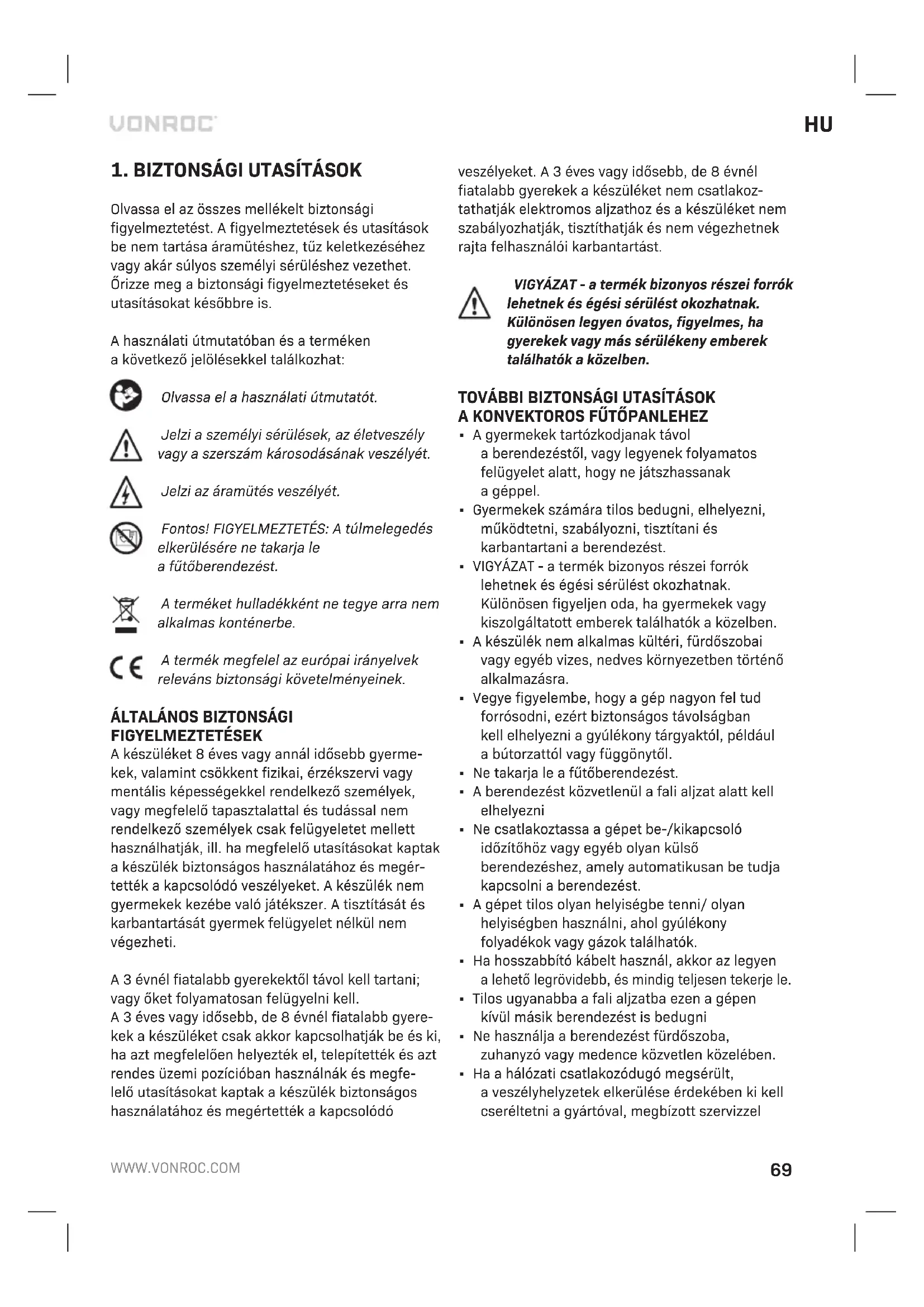 Olvassa el az összes mellékelt biztonsági figyelmeztetést. Afigyelmeztetések és utasítások be nem tartása áramütéshez, tűz keletkezéséhez vagy akár súlyos személyi sérüléshez vezethet. Őrizze meg abiztonsági figyelmeztetéseket és utasításokat későbbre is. Ahasználati útmutatóban és aterméken akövetkező jelölésekkel találkozhat: Olvassa el ahasználati útmutatót. Jelzi aszemélyi sérülések, az életveszély vagy aszerszám károsodásának veszélyét. Jelzi az áramütés veszélyét. Fontos! FIGYELMEZTETÉS: Atúlmelegedés elkerülésére ne takarja le afűtőberendezést. Aterméket hulladékként ne tegye arra nem alkalmas konténerbe. Atermék megfelel az európai irányelvek releváns biztonsági követelményeinek.