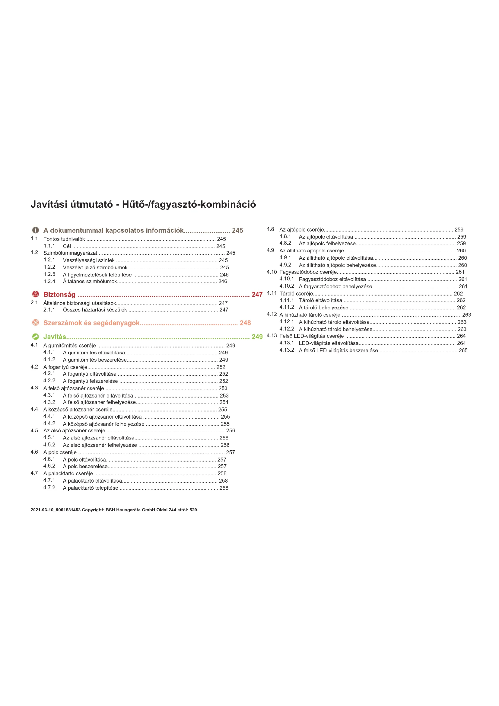 A felső LED-világítás beszerelése .....................................................265 Javítási útmutató-Hűtő-/fagyasztó-kombináció 2021-03-10_9001631453 Copyright: BSH Hausgeräte GmbH Oldal244ettől:529A dokumentummal kapcsolatos információk