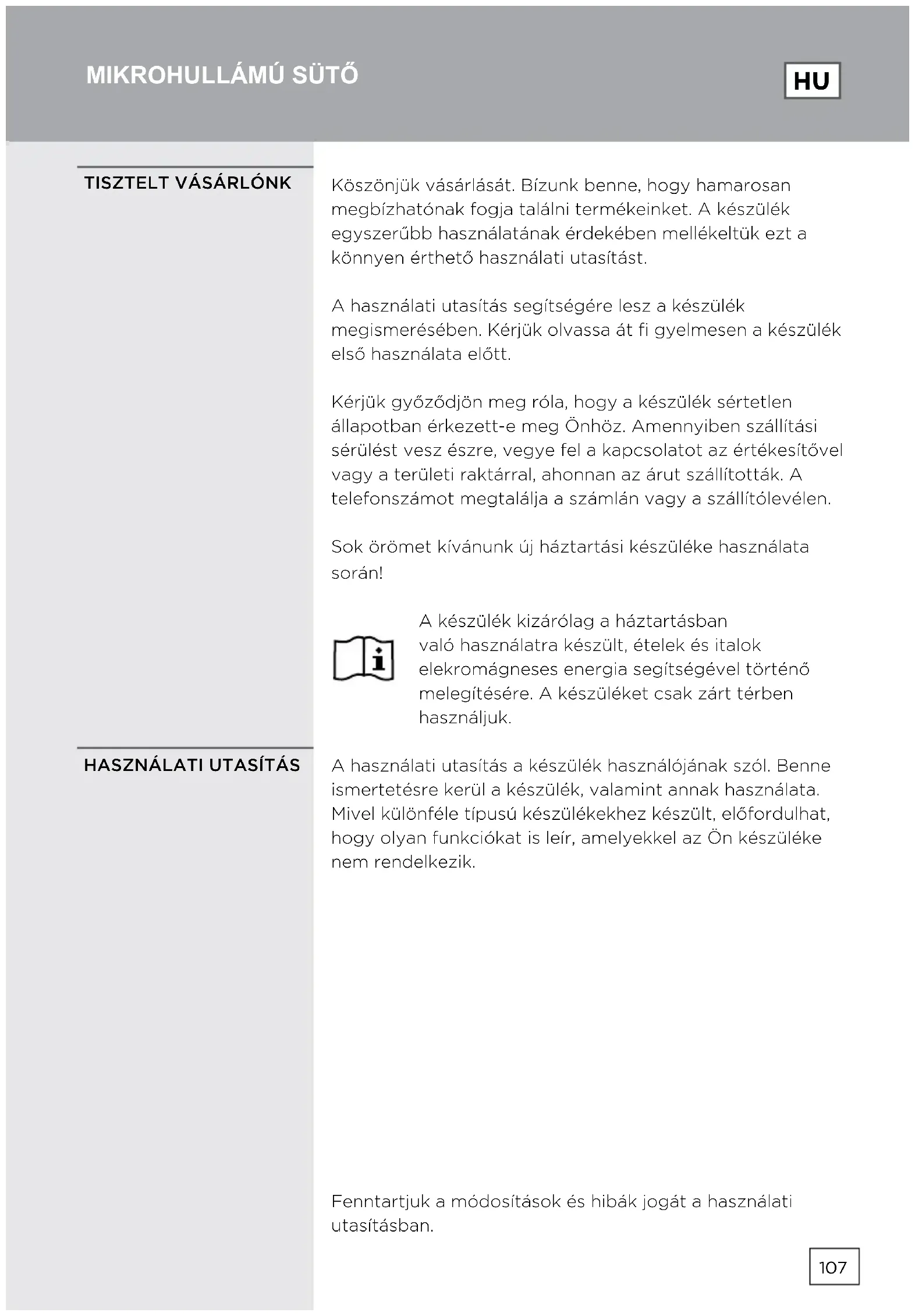 Köszönjük vásárlását. Bízunk benne, hogy hamarosan megbízhatónak fogja találni termékeinket. A készülék egyszerűbb használatának érdekében mellékeltük ezt a könnyen érthető használati utasítást. A használati utasítás segítségére lesz a készülék megismerésében. Kérjük olvassa át fi gyelmesen a készülék első használata előtt. Kérjük győződjön meg róla, hogy a készülék sértetlen állapotban érkezett-e meg Önhöz. Amennyiben szállítási sérülést vesz észre, vegye fel a kapcsolatot az értékesítővel vagy a területi raktárral, ahonnan az árut szállították. A telefonszámot megtalálja a számlán vagy a szállítólevélen. Sok örömet kívánunk új háztartási készüléke használata során! A készülék kizárólag a háztartásban való használatra készült, ételek és italok elekromágneses energia segítségével történő melegítésére. A készüléket csak zárt térben használjuk. A használati utasítás a készülék használójának szól. Benne ismertetésre kerül a készülék, valamint annak használata. Mivel különféle típusú készülékekhez készült, előfordulhat, hogy olyan funkciókat is leír, amelyekkel az Ön készüléke nem rendelkezik. Fenntartjuk a módosítások és hibák jogát a használati utasításban.