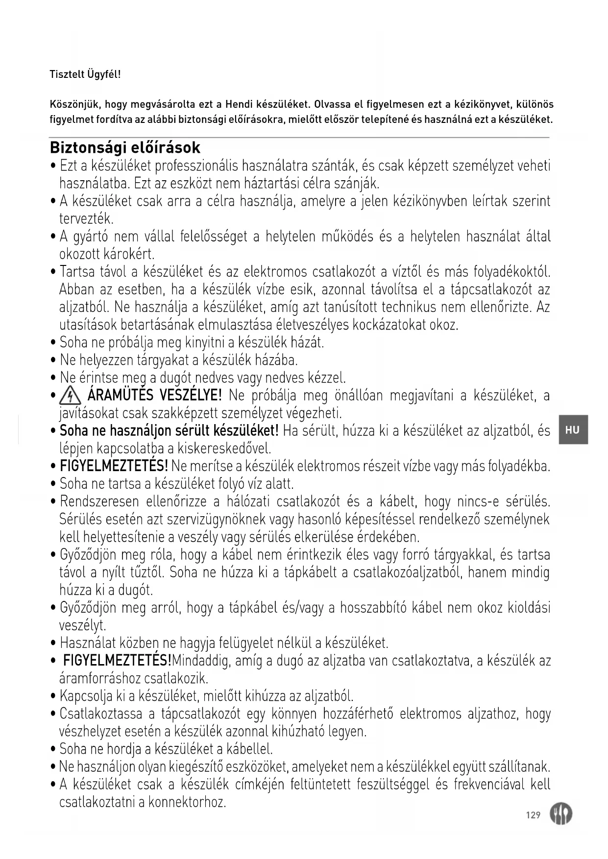 Tisztelt Ügyfél! Köszönjük, hogy megvásárolta ezt a Hendi készüléket. Olvassa el figyelmesen ezt a kézikönyvet, különös figyelmet fordítva az alábbi biztonsági előírásokra, mielőtt először telepítené és használná ezt a készüléket. Biztonsági előírások