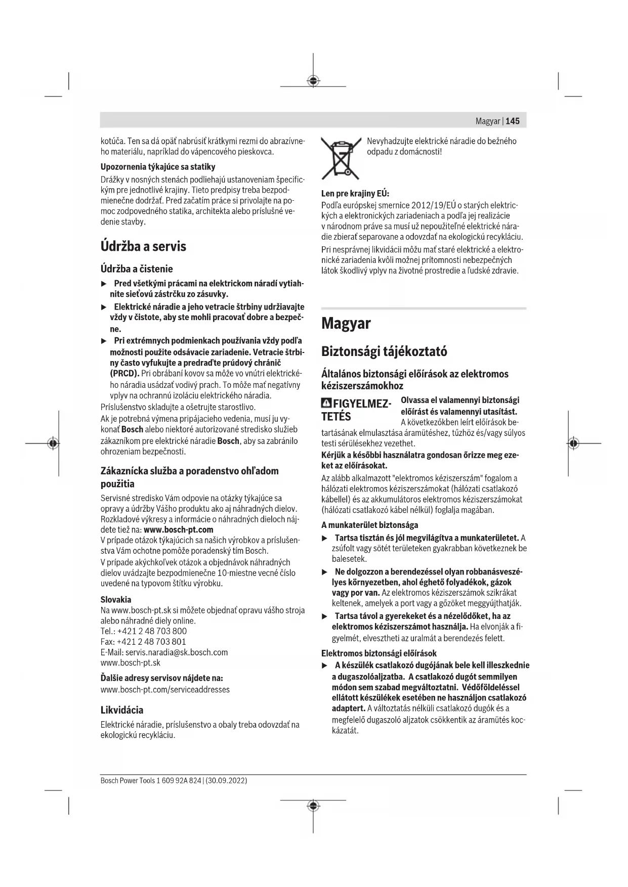 Az ezen előírásokban megadott rezgési szint egy szabvány- ban rögzített mérési módszerrel került meghatározásra és az elektromos kéziszerszámok összehasonlítására ez az érték felhasználható. Ez az érték a rezgési terhelés ideiglenes becslésére is alkalmas. A megadott rezgésszint az elektromos kéziszerszám fő alkal- mazási területein való használat során fellépő érték. Ha az elektromos kéziszerszámot más alkalmazásokra, eltérő be- tétszerszámokkal vagy nem kielégítő karbantartás mellett használják, a rezgésszint a fenti értéktől eltérhet. Ez az egész munkaidőre vonatkozó rezgési terhelést lényegesen megnö- velheti. A rezgési terhelés pontos megbecsüléséhez figyelembe kell venni azokat az időszakokat is, amikor a berendezés kikap- csolt állapotban van, vagy amikor be van ugyan kapcsolva, de nem kerül ténylegesen használatra. Ez az egész munka- időre vonatkozó rezgési terhelést lényegesen csökkentheti. Hozzon kiegészítő biztonsági intézkedéseket a kezelőnek a rezgések hatása elleni védelmére, például: Az elektromos ké- ziszerszám és a betétszerszámok karbantartása, a kezek me- legen tartása, a munkamenetek megszervezése. 1 609 92A 824 | (30.09.2022) Bosch Power ToolsMagyar | 151 Összeszerelés Védőberendezés felszerelése u Az elektromos kéziszerszámon végzendő bármely munka megkezdése előtt húzza ki a csatlakozó dugót a dugaszolóaljzatból. Figyelem: Ha a csiszolókorong üzem közben eltörött, vagy ha a védőbúra vagy az elektromos kéziszerszám felvevő egy- ségei megrongálódtak, az elektromos kéziszerszámot azon- nal el kell küldeni a Vevőszolgálatnak, a címeket lásd a „Vevő- szolgálat és alkalmazási tanácsadás“ fejezetben. Védőbúra csiszoláshoz Tegye fel a (6) védőbúrát a tengelynyakra. Állítsa be a mun- kamenetnek megfelelően a (6) védőbúra helyzetét és rete- szelje a (6) védőbúrát a (7) rögzítő csavarral. u Állítsa be úgy a (6) védőbúra helyzetét, hogy a kezelő irányába ne léphessenek ki szikrák. Védőbúra daraboláshoz u Ha kötött csiszolóanyaggal ellátott koronggal végez darabolást, használja mindig a darabolásra szolgáló (14) védőbúrát. u Kőben végzett darabolási munkákhoz megfelelő porel- szívásról kell gondoskodni. A darabolásra szolgáló (14) védőbúrát ugyanúgy kell felsze- relni, mint a csiszolásra szolgáló (6) védőbúrát. Elszívó búra daraboláshoz, vezetőszánnal Az elszívóbúra felszereléséhez vezetősínnel való daraboláskor(23) vegye figyelembe az elszívóbúra haszná- lati útmutatóját. Pótfogantyú u Az elektromos kéziszerszámát csak a (3) pótfogantyú- val együtt használja. A munkavégzési módszernek megfelelően csavarja fel a (3) pótfogantyút a hajtóműfej jobb vagy bal oldalára. Kézvédő u A (18) gumi csiszolótárcsával vagy a fazékkefével / le- gyezős csiszolókoronggal végzendő munkákhoz min- dig szerelje fel a (16) kézvédőt. A (16) kézvédőt a (3) pótfogantyúval rögzítse. A csiszolószerszámok felszerelése u Az elektromos kéziszerszámon végzendő bármely munka megkezdése előtt húzza ki a csatlakozó dugót a dugaszolóaljzatból. u Ne érjen hozzá a csiszoló- és darabolókorongokhoz, amíg le nem hűltek. A korongok a munka során igen erő- sen felforrósodnak. Tisztítsa meg a (5) csiszolóorsót és valamennyi felszerelésre kerülő alkatrészt. A csiszolószerszámok rögzítéséhez és kilazításához nyomja meg a (1) tengely reteszelőgombot, hogy ezzel reteszelje a csiszolótengelyt. u A tengely reteszelőgombot csak teljesen nyugalmi ál- lapotban lévő csiszolótengely esetén szabad meg- nyomni. Ellenkező esetben az elektromos kéziszerszám megrongálódhat. Csiszoló-/darabolótárcsa Vegye figyelembe a csiszolószerszámok méreteit. A nyílás át- mérőjének illeszkednie kell a befogó karimához. Redukáló idomot, vagy adaptert nem szabad használni. A gyémántbetétes darabolótárcsák alkalmazása során ügyel- jen arra, hogy a gyémántbetétes darabolótárcsán található nyíl iránya megegyezzen az elektromos kéziszerszám forgás- irányával (lásd a hajtóműfejen a forgásirányt jelző nyilat). A szerelési sorrend az ábrás oldalon látható. A csiszoló-/daraboló korong rögzítéséhez csavarja fel, majd a körmöskulccsal szorítsa meg a(10)rögzítőanyát (lásd „Gyorsbefogó anya ”, Oldal151). u A csiszolószerszámok felszerelése után a készülék be- kapcsolása előtt győződjön meg arról, hogy a csiszoló- szerszám helyesen van felszerelve és szabadon forog. Gondoskodjon arról, hogy a csiszolószerszám ne érjen hozzá a védőbúrához vagy más alkatrészekhez. A (8)befogó karimába a központozó perem kö- ré egy műanyag alkatrész (O-gyűrű) van behe- lyezve. Ha az O-gyűrű hiányzik, vagy meg- rongálódott, a (8)befogó karimát a további használat előtt okvetlenül ki kell cserélni. Legyezős csiszolókorong u A legyezős csiszolókoronggal végzendő munkákhoz mindig szerelje fel a (16) kézvédőt. Gumi csiszolótányér u A (18) gumi csiszolótányérral végzendő munkákhoz mindig szerelje fel a (16) kézvédőt. A szerelési sorrend az ábrás oldalon látható. A (18) gumi csiszolótányér felszerelése előtt tegye fel a 2 da- rab (17) távtartó tárcsát a (5) csiszolótengelyre. Csavarja fel a (20) hengeres anyát és húzza meg szorosra a kétkörmös kulccsal. Sarokcsiszoló/kefés tárcsa u A sarokcsiszolóval vagy a kefés tárcsával végzendő munkákhoz mindig szerelje fel a (16) kézvédőt. A szerelési sorrend az ábrás oldalon látható. A sarokcsiszolót / kefés tárcsát annyira fel kell tudni csava- rozni a csiszolótengelyre, hogy szorosan felfeküdjön a csi- szolótengely menetének végén található csiszolótengely kari- mára. Húzza meg egy villáskulccsal szorosra a sa