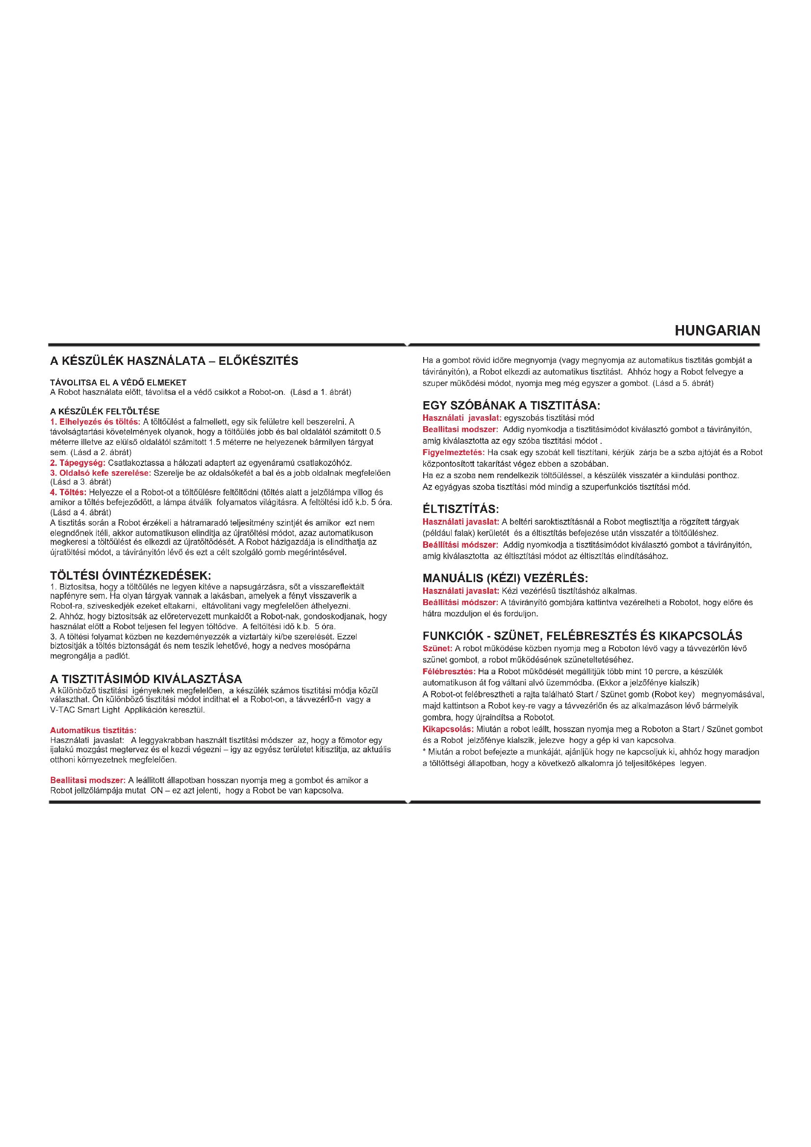 biztositják a töltés biztonságát és nem teszik lehetővé, hogy a nedves mosópárna megrongálja a padlót. A TISZTITÁSIMÓD KIVÁLASZTÁSA A különbőző tisztitási igényeknek megfelelően, a készülék számos tisztitási módja közül választhat. Ön különböző tisztitási módot indithat el a Robot-on, a távvezérlő-n vagy a V-TAC Smart Light Applikáción keresztül. Automatikus tisztitás: Használati javaslat: A leggyakrabban használt tisztitási módszer az, hogy a főmotor egy ijalakú mozgást megtervez és el kezdi végezni – igy az egyész területet kitisztitja, az aktuális otthoni környezetnek megfelelően. Beallitasi modszer: A leállitott állapotban hosszan nyomja meg a gombot és amikor a Robot jellzőlámpája mutat ON – ez azt jelenti, hogy a Robot be van kapcsolva. HUNGARIANHa a gombot rövid időre megnyomja (vagy megnyomja az automatikus tisztitás gombját a távirányitón), a Robot elkezdi az automatikus tisztitást. Ahhóz hogy a Robot felvegye a szuper műkődési módot, nyomja meg még egyszer a gombot. (Lásd a 5. ábrát) EGY SZÓBÁNAK A TISZTITÁSA: Használati javaslat: egyszobás tisztitási mód Beallitasi modszer: Addig nyomkodja a tisztitásimódot kiválasztó gombot a távirányitón, amig kiválasztotta az egy szóba tisztitási módot . Figyelmeztetés: Ha csak egy szobát kell tisztítani, kérjük zárja be a szba ajtóját és a Robot központosított takarítást végez ebben a szobában. Ha ez a szoba nem rendelkezik töltőüléssel, a készülék visszatér a kiindulási ponthoz. Az egyágyas szoba tisztítási mód mindig a szuperfunkciós tisztítási mód. ÉLTISZTÍTÁS: Használati javaslat: A beltéri saroktisztításnál a Robot megtisztítja a rögzített tárgyak (például falak) kerületét és a éltisztítás befejezése után visszatér a töltőüléshez. Beállítási módszer: Addig nyomkodja a tisztitásimódot kiválasztó gombot a távirányitón, amig kiválasztotta az éltisztítási módot az éltisztítás elindításához. MANUÁLIS (KÉZI) VEZÉRLÉS: Használati javaslat: Kézi vezérlésű tisztításhóz alkalmas. Beállítási módszer: A távirányító gombjára kattintva vezérelheti a Robotot, hogy előre és hátra mozduljon el és forduljon. FUNKCIÓK - SZÜNET, FELÉBRESZTÉS ÉS KIKAPCSOLÁS Szünet: A robot működése közben nyomja meg a Roboton lévő vagy a távvezérlőn lévő szünet gombot, a robot működésének szüneteltetéséhez. Félébresztés: Ha a Robot műkődését megállitjük több mint 10 percre, a készülék automatikuson át fog váltani alvó üzemmódba. (Ekkor a jelzőfénye kialszik) A Robot-ot felébresztheti a rajta található Start / Szünet gomb (Robot key) megnyomásával, majd kattintson a Robot key-re vagy a távvezérlőn és az alkalmazáson lévő bármelyik gombra, hogy újraindítsa a Robotot. Kikapcsolás: Miután a robot leállt, hosszan nyomja meg a Roboton a Start / Szünet gombot és a Robot jelzőfénye kialszik, jelezve hogy a gép ki van kapcsolva.