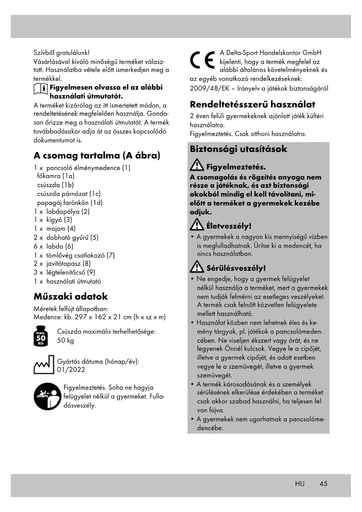 fel a sérült területre, majd erősen nyomja oda. Tárolás, tisztítás Gyakran cserélje a termékben lévő vizet, külö- nösen ha meleg van és ha szennyezett a víz! A terméket mindig leengedett állapotban, száraz, tiszta és szobahőmérsékletű helyen tárolja, ha azt nem használja. A szelepet tárolás közben mindig zárva kell tartani. A terméket kizárólag vízzel vagy szappanos vízzel tisztítsa, soha ne használjon erős tisztítószert. Ne rakjon éles tár- gyakat a termékre a téli tároláskor, és ne szórja be talkummal. Tudnivalók a hulladékkeze- lésről Az árucikket és a csomagolóanyagot az érvé- nyes helyi előírásoknak megfelelően ártalmatla- nítsa. A csomagolóanyagok, pl. nylonzacskók, nem kerülhetnek gyermekek kezébe. A csoma- golóanyagot gyermekek számára hozzá nem férhető helyen tárolja. A terméket és csomagolását környezet- barát módon selejtezze le. Az újrahasznosító kód a különböző anyagokat jelöli, hogy azok nyersanyag- ként újrahasznosíthatók legyenek. A kód az újrahasznosítás jelből - értsd: az újra- hasznosítás körforgás jelölése - és egy számból áll, ami adott anyagot jelöl. A garanciával és a szerviz lebonyolításával kapcsolatos útmutató A termék nagy gondossággal és állandó ellenőr- zés mellett készült. A DELTA-SPORT HANDELS- KONTOR GmbH privát végső felhasználóknak a vásárlás dátumától számított három év (garancia időtartama) garanciát ad erre a termékre a kö- vetkező rendelkezések szerint. A garancia csak anyaghibára és feldolgozási hibára érvényes. A garancia nem terjed ki a szokásos elhasználó- dásnak kitett, ezért kopó alkatrésznek tekintendő alkatrészekre (pl. elemek), valamint a törékeny alkatrészekre sem, például a kapcsolókra, az akkumulátorokra vagy az üvegből készült alkatrészekre. Kizárásra kerül a garanciaigény, ha a terméket szakszerűtlenül vagy helytelenül, nem rendel- tetésszerűen vagy nem az előirányzott felhasz- nálási körben használták, vagy figyelmen kívül hagyták a kezelési útmutató előírásait, kivéve, ha a végső felhasználó bizonyítja, hogy olyan anyag- vagy feldolgozási hiba áll fenn, amely nem a fent említett körülmények valamelyikéből ered. A garanciaigény csak a garancia időtartamán belül, az eredeti pénztári bizonylat bemutatásá- val érvényesíthető. Ezért kérjük, őrizze meg az eredeti pénztári bizonylatot. A garancia, a tör- vényes garancia vagy a méltányosság alapján végzett esetleges javítások a garancia időtar- tamát nem hosszabbítják meg. Ez vonatkozik a kicserélt és javított alkatrészekre is. Kérjük, hogy reklamáció esetén először az aláb- bi szervizvonalat hívja, vagy e-mailen keressen minket. Garanciális esetekben a terméket saját döntésünk alapján ingyenesen megjavítjuk, kicseréljük vagy megtérítjük a vételárat. A garan- ciából további jogok nem következnek. A jelen garancia nem korlátozza az Ön törvé- nyes jogait, különösen a mindenkori értékesítővel szembeni garanciaigényét IAN: 385205_2107 Szerviz Magyarország Tel.: 06800 21225 E-Mail: deltasport@lidl.hu49SI Čestitamo! Z nakupom ste se odločili za visokokakovos- ten izdelek. Pred prvo uporabo se seznanite z izdelkom. V ta namen natančno preberite naslednje navodilo za uporabo. Izdelek uporabljajte, kot je opisano, in za navedena področja uporabe. To navodilo za uporabo skrbno hranite. Če boste izdelek predali tretjim osebam, zraven priložite vso dokumentacijo. Obseg dobave (sl. A) 1 x doživljajski bazenček za otroke (1) glavna komora (1a) tobogan (1b) blazinasta obloga tobogana (1c) papagaj na štoru (1d) 1 x kotalna proga za žogo (2) 1 x kača (3) 1 x opica (4) 2 x obroček za met (5) 6 x žoga (6) 1 x adapter (7) 2 x zaplata za popravilo (8) 3 x odzračevalna cevčica (9) 1 x navodilo za uporabo Tehnični podatki Mere napihnjeno: Bazenček: pribl. 297 x 162 x 21 cm (D x Š x V) Največja teža uporabnika na toboganu: 50 kg Datum izdelave (mesec/leto): 01/2022 Opozorilo. Nikoli ne puščajte otroka brez nadzora - nevarnost utopitve. Delta-Sport Handelskontor GmbH izjavlja, da je ta izdelek skladen z naslednjimi temeljnimi zahtevami in drugimi ustreznimi določbami: 2009/48/ES – Direktiva o varnosti igrač Namenska uporaba Ta izdelek je igrača za otroke od 2. leta dalje za uporabo na prostem. Opozorilo. Samo za domačo uporabo. Varnostni napotki Opozorilo. Embalažni in pritrditveni materiali niso sestavni del igrače in jih je treba iz varnostnih razlogov vedno odstraniti, preden se izdelek preda otrokom za igro. Smrtna nevarnost!