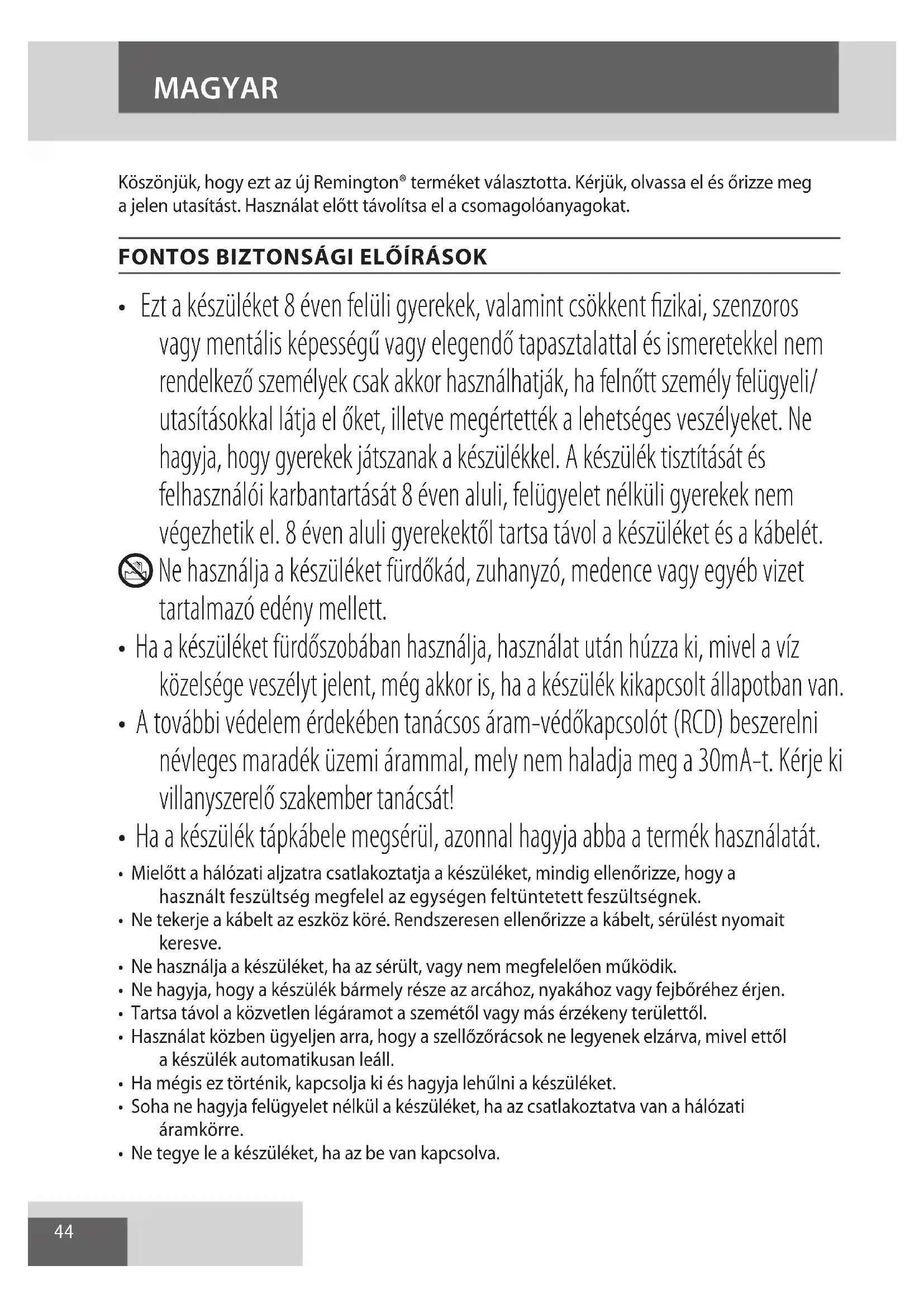 AE44 Köszönjük, hogy ezt az új Remington® terméket választotta. Kérjük, olvassa el és őrizze meg a jelen utasítást. Használat előtt távolítsa el a csomagolóanyagokat.