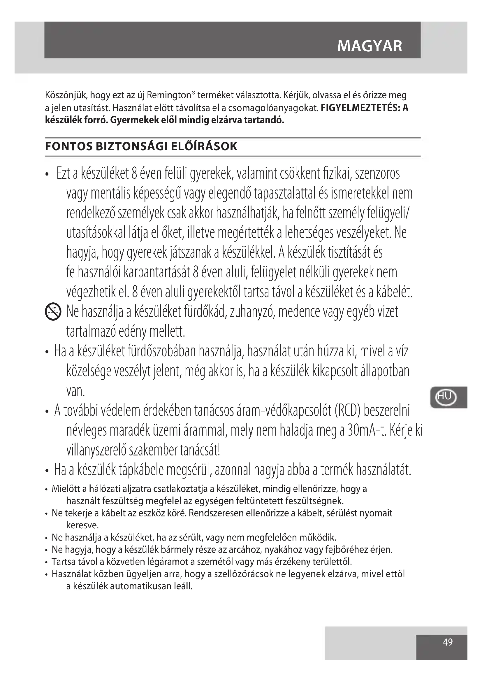 - Ezt a készüléket 8 éven felüli gyerekek, valamint csökkent fizikai, szenzoros vagy mentális képességű vagy elegendő tapasztalattal és ismeretekkel nem rendelkező személyek csak akkor használhatják, ha felnőtt személy felügyeli/ utasításokkal látja el őket, illetve megértették a lehetséges veszélyeket. Ne hagyja, hogy gyerekek játszanak a készülékkel. A készülék tisztítását és felhasználói karbantartását 8 éven aluli, felügyelet nélküli gyerekek nem végezhetik el. 8 éven aluli gyerekektől tartsa távol a készüléket és a kábelét. L Ne használja a készüléket fürdőkád, zuhanyzó, medence vagy egyéb vizet tartalmazó edény mellett.