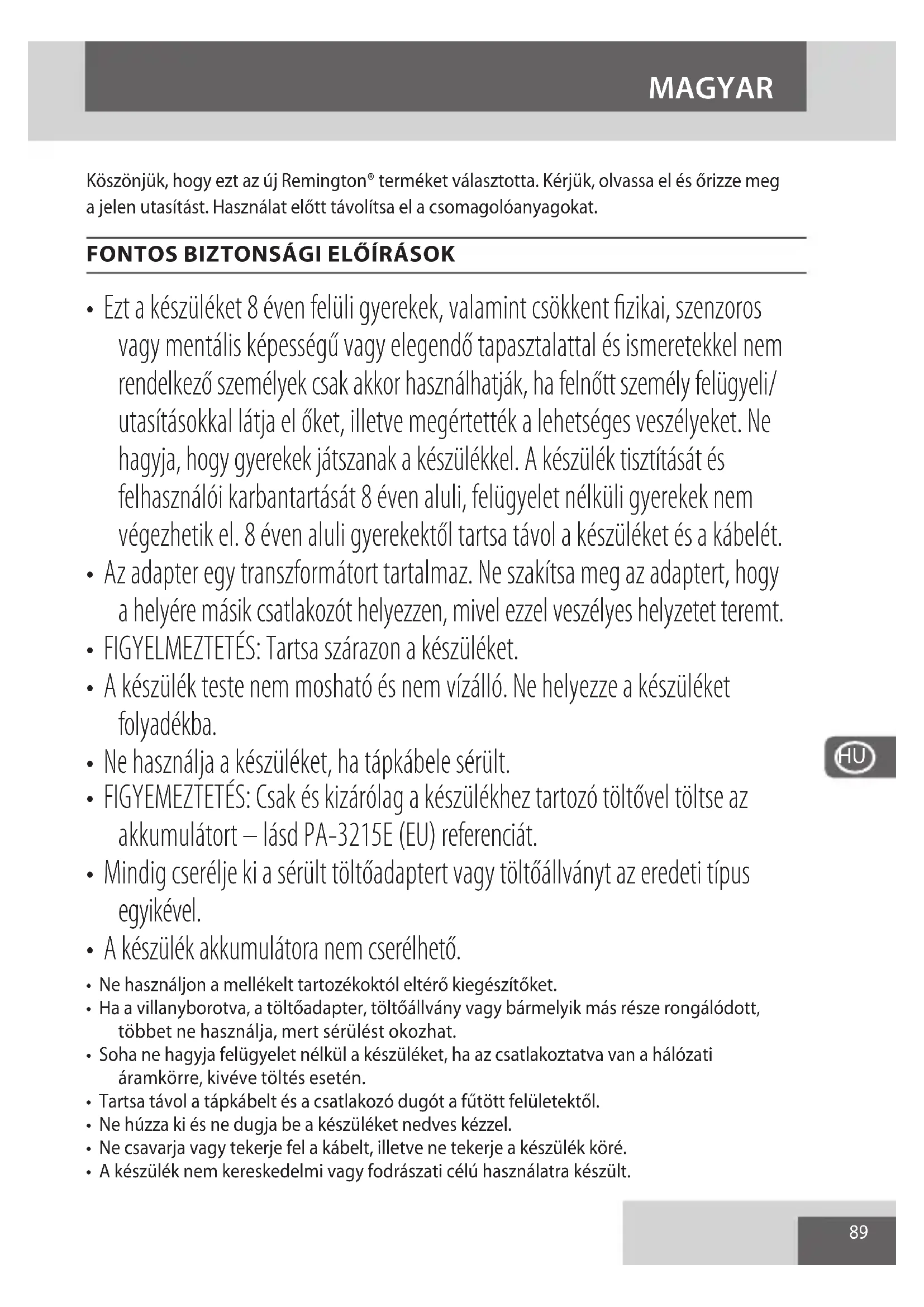 - FIGYEMEZTETÉS: Csak és kizárólag a készülékhez tartozó töltővel töltse az akkumulátort – lásd PA-3215E (EU) referenciát.