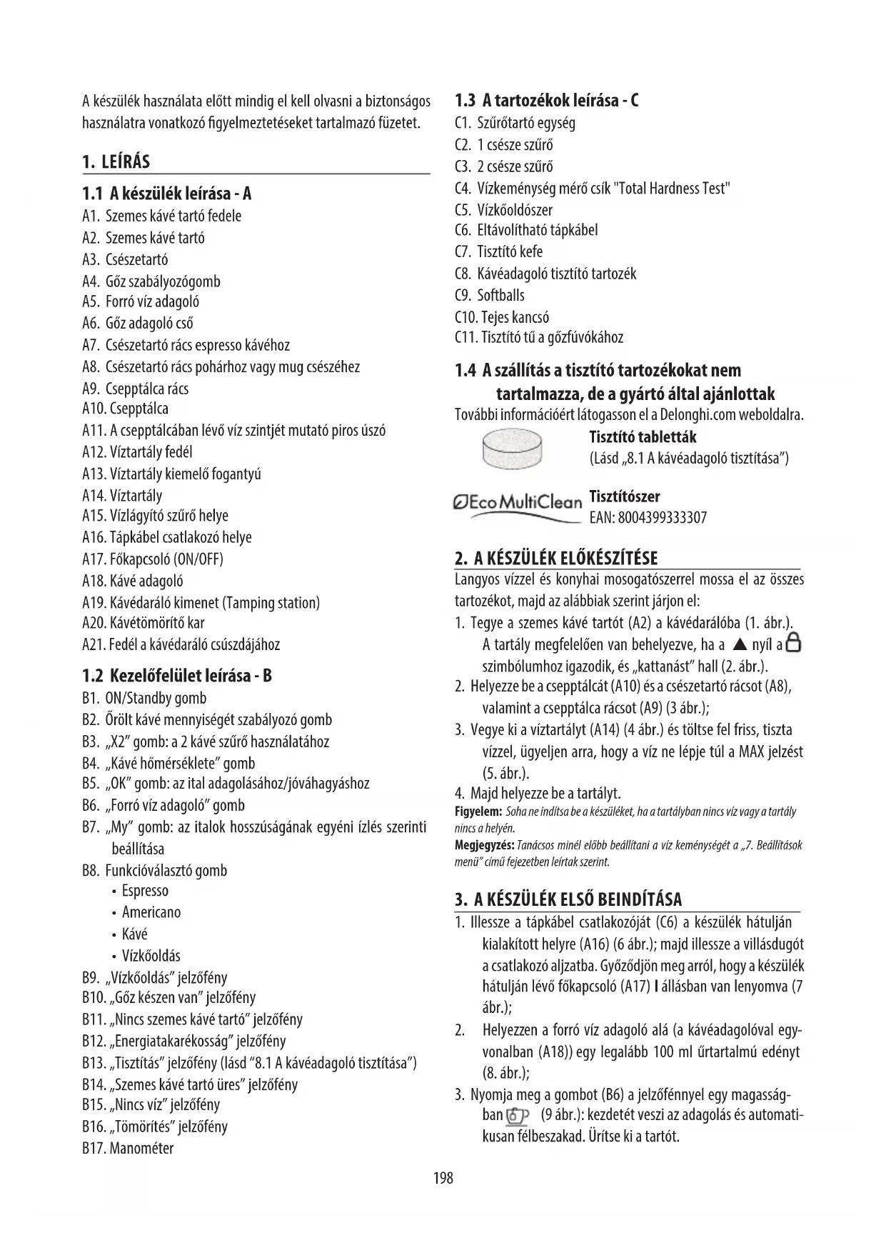 - Kizárolag De'Longhi vizkooldo hasznalatat javasoljuk. Nem megfelelo vizkooldo hasznalata, valamint a nem szabalyosan vegzett vizkooldas oyan krokat okozhat, melyek javitasa nem tartozik a gyartó altal vallalt garancia korébe.