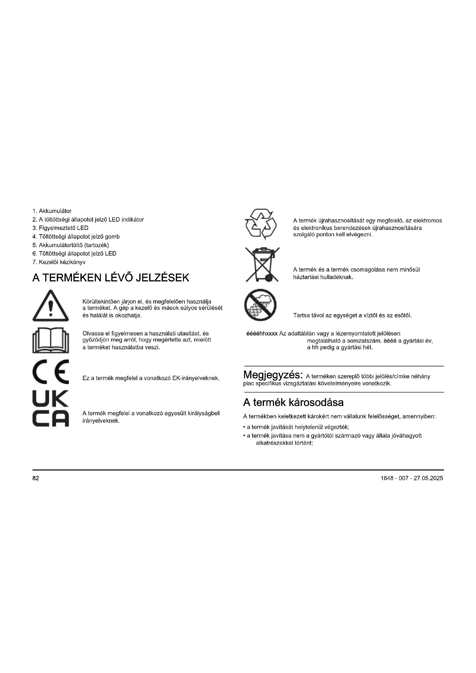 1648 - 007 - 27.05.2025Hulladékkezelés A szimbólum azt jelzi, hogy a termék nem minősül háztartási hulladéknak. Hasznosítsa újra az elektromos és elektronikus berendezések helyi gyűjtőrendszerében. Ez hozzájárul az élettartam végi hulladékkezeléshez. További információért forduljon a helyi hatóságokhoz, a hulladék ártalmatlanítási szolgáltatást végző vállalkozáshoz, a szervizkereskedőjéhez vagy kiskereskedőhöz. A helytelen ártalmatlanítás potenciálisan negatív hatással lehet a környezetre és az emberi egészségre a veszélyes anyagok esetleges jelenléte miatt. Megjegyzés: A szimbólum a terméken vagy annak csomagolásán található.