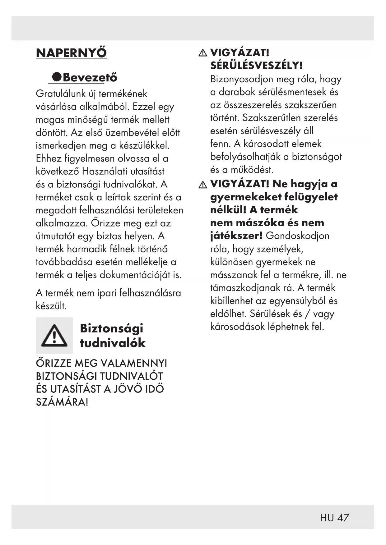 VIGYÁZAT! BILLENÉSVESZÉLY! Mindig gondoskodjon a termék stabil állásáról. Helyezze a napernyőt egy ehhez megfelelő napernyőállványba/ talajhüvelybe. Máskülönben a napernyő felborulhat és sérülések valamint anyagi károk léphetnek fel.