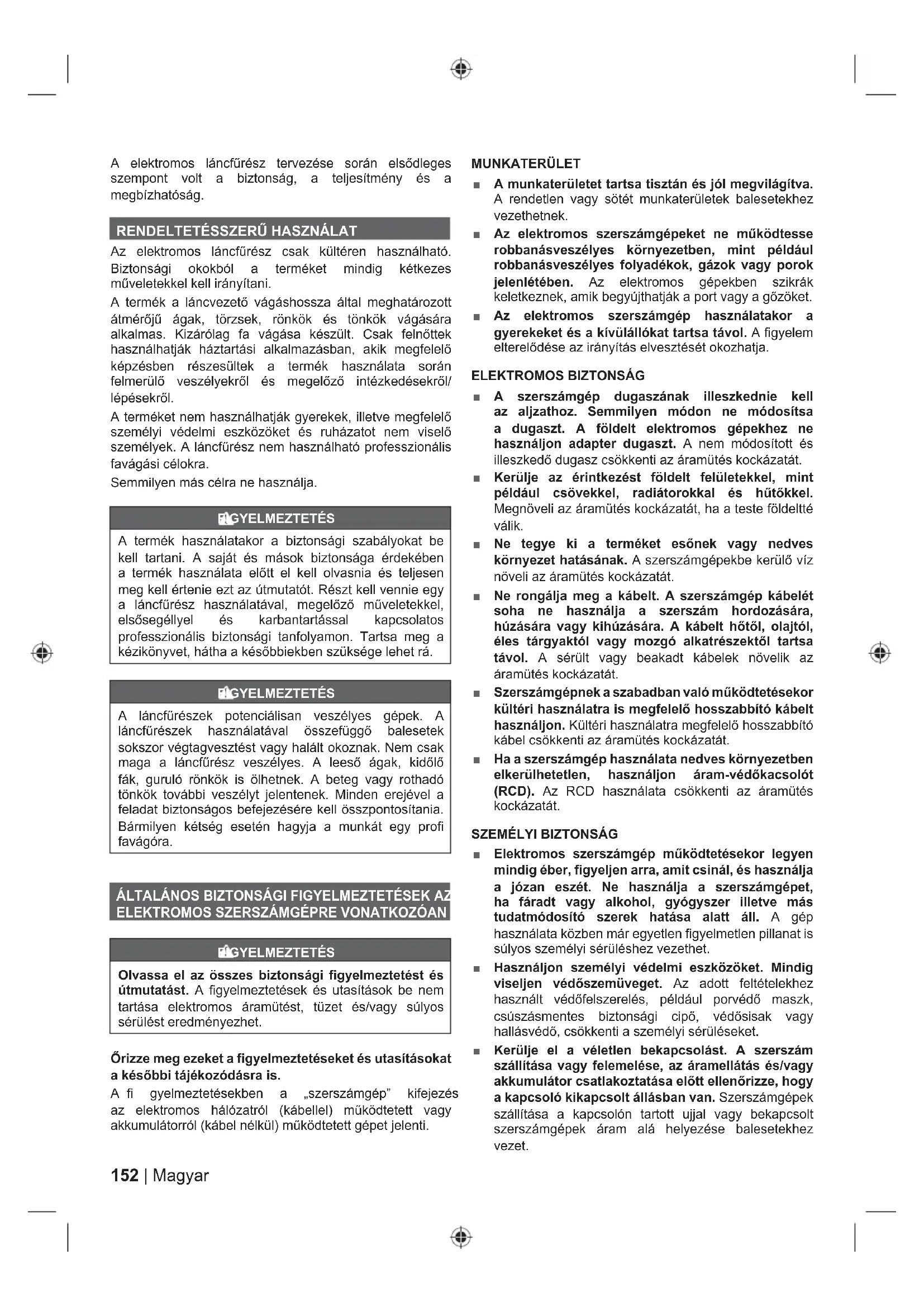 ■ Javasolt, hogy a termék első használatakor a rönköket bakon vagy bölcsőn vágja. ■ Ügyeljen rá, hogy az összes védőburkolat, fogantyú és tüskés ütköző megfelelően felszerelt és jó állapotú legyen. ■ A terméket használó személyeknek jó egészségi állapotban kell lenniük. A készülék nehéz, ezért a kezelőnek fizikailag jó kondícióban kell lennie. A kezelőnek ébernek, jó látással, reflexekkel, egyensúlyérzékkel és kézügyességgel kell rendelkeznie. Ha bármilyen gondja van, ne működtesse a terméket. ■ Ne kezdje meg a termék használatát, amíg meg nem tisztította a munkaterületet, nem vett fel stabil testtartást és nincs meg a tervezett menekülési útvonal a fa dőlése esetére. ■ Figyeljen a kenőanyagpára és a fűrészpor kibocsátásra. Ha szükséges, viseljen maszkot vagy álarcot. ■ Ha a tápvezeték megsérül, csakis engedéllyel rendelkező szervizben javíttassa. ■ A tápkábel mindig legyen megfelelően elvezetve, távol a vágási területtől. Az áram alatt levő kábel átvágása mellett a rosszul elvezetett kábel miatt elesés vagy felborulás következhet be. ■ Ne vágjon szőlőtőkét és/vagy kisméretű bozótot (75 mm-nél kisebb átmérőjűt). ■ Működés során mindig két kézzel tartsa a láncfűrészt. Tartsa a láncfűrészt erősen, úgy hogy az ujjai öleljék körül a fogantyúkat. Jobb kézzel a hátsó fogantyút, bal kézzel pedig az elülső fogantyút fogja. ■ A termék elindítása előtt győződjön meg róla, hogy ne érjen hozzá semmilyen tárgyhoz. ■ Semmilyen módon ne módosítsa a fűrészt, és ne használja fel olyan tartozékok vagy eszközök energiaellátására, amit a termék gyártója nem javasol. ■ A kezelő közelében lennie kell egy elsősegélydoboznak, amelynek nagyméretű kötszert és a figyelemfelhívó eszközt (pl. síp) kell tartalmaznia. Egy nagyobb, átfogóbb készletnek kell a közelben lennie. ■ A termék használatakor mindig viseljen sisakot. Egy hálós ellenzővel felszerelt sisak segít csökkenteni az arc és a fej sérülési kockázatát, ha visszarúgás történik. ■ Egy nem megfelelően megfeszített lánc leugorhat a láncvezetőről, és súlyos sérülést vagy halált okozhat. A lánc hossza függ a hőmérséklettől. Rendszeresen ellenőrizze a feszességet. ■ Egy biztonságosan rögzített fadarabon végzett egyszerű vágásokkal szokja meg az új láncfűrész használatát. Bármikor megteheti ezt, ha egy ideje nem használta a fűrészt. ■ A mozgó alkatrészek megérintéséből eredő balesetveszély csökkentésére minden esetben állítsa le a motort, használja a láncféket, és húzza ki a csatlakozót a konnektorból. Ellenőrizze, hogy minden mozgó rész teljesen megállt: – mielőtt magára hagyná a terméket – tisztítás vagy eltömődés megszüntetése előtt – mielőtt felszerelné vagy eltávolítaná a tartozékokat – ellenőrzés, karbantartás vagy a gépen végzett bármilyen művelet megkezdése előtt ■ A munkaterület mérete függ a végrehajtandó munkától, és a fa méretétől, vagy a munkadarab nagyságától. Például, egy fa kidöntéséhez nagyobb terület kell, mint másfajta vágásokhoz, pl. keresztvágásokhoz stb. A kezelőnek ébernek kell lennie, és oda kell figyelnie mindenre a munkaterületen. ■ Ne vágjon úgy, hogy a teste egy vonalba kerül a láncvezetővel és a lánccal. Ha visszarúgást észlel, ezzel elkerülheti, hogy a lánc érintkezzen a fejével vagy az arcával. ■ Ne használjon oda-vissza fűrészelő mozdulatot, hagyja, hogy a lánc végezze a dolgát, tartsa élesen a láncot, és ne próbálja áttolni a láncot a vágáson. ■ Ne fejtsen ki nyomóerőt a láncfűrészre a vágás végén. Legyen készen, hogy átvegye a fűrész súlyát, amint az kiszabadul a vágásból. Ha nem így tesz, súlyos személyi sérülés lehet az eredmény. ■ Ne állítsa le a fűrészt a vágási művelet közepén. Addig működtesse a fűrészt, amíg ki nem veszi a vágásból. Személyi védelmi eszközök A szakemberek által is használt jó minőségű személyi védelmi eszközök segítenek csökkenteni a kezelő sérülésének kockázatát. A következő eszközöket kell használni a láncfűrész használatakor: Védősisak – meg kell felelnie az EN 397 szabványnak, és CE jelöléssel kell rendelkeznie Fülvédő – meg kell felelnie az EN 352-1 szabványnak, és CE jelöléssel kell rendelkeznie Szem- és arcvédő – CE jelöléssel kell rendelkeznie és meg kell felelnie az EN 166 (a védőszemüvegek esetében) vagy az EN 1731 (hálós arcvédő esetében) szabványnak Kesztyűk – meg kell felelnie az EN381-7 szabványnak, és CE jelöléssel kell rendelkeznie Lábvédelem (vágásálló)156 | Magyar – meg kell felelnie az EN381-5 szabványnak és CE jelöléssel kell rendelkeznie, és teljes körű védelmet kell nyújtania. Láncfűrész biztonsági lábbelik – meg kell felelniük az EN ISO 20345:2004 szabványnak és láncfűrész ábrás jelöléssel kell rendelkeznie az EN 381-3 szabványnak való megfelelés igazolására. (Az alkalmi felhasználók használhatnak acél orrmerevítővel ellátott biztonsági lábbelit is lábszárvédőkkel, ami megfelel az EN 381-9 szabványnak, ha a talaj egyenletes és kicsi az aljnövényzetbe való felbukás vagy beakadás esélye) Láncfűrész kabátok a felsőtest védelméhez – meg kell felelnie az EN 381-11 szabványnak, és CE jelöléssel kell rendelkeznie ALAPVETŐ FAKIVÁGÁSI, ÁGAZÁSI ÉS KERESZTVÁ-