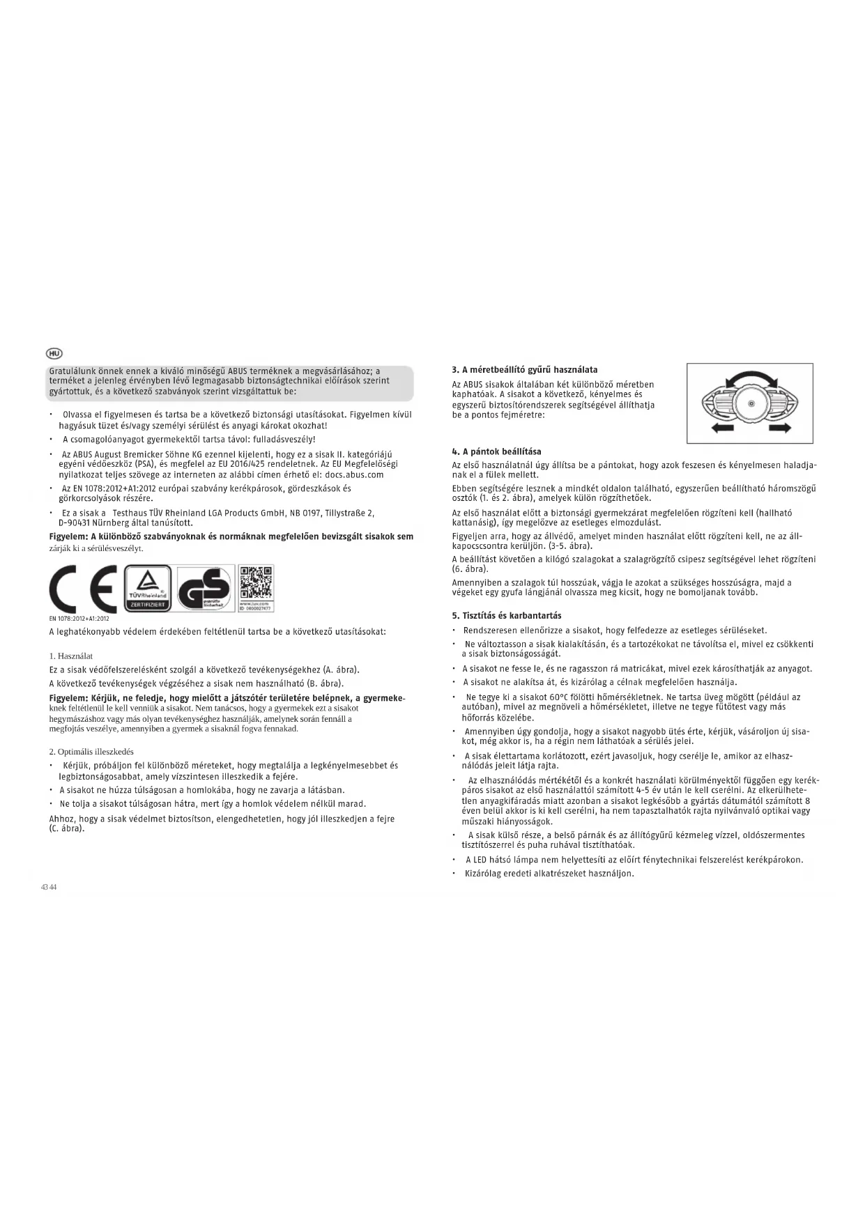 - Az ABUS August Bremicker Söhne KG ezennel kijelenti, hogy ez a sisak II. kategóriájú egyéni védőeszköz (PSA), és megfelel az EU 2016/425 rendeletnek. Az EU Megfelelőségi nyilatkozat teljes szövege az interneten az alábbi címen érhető el: docs.abus.com