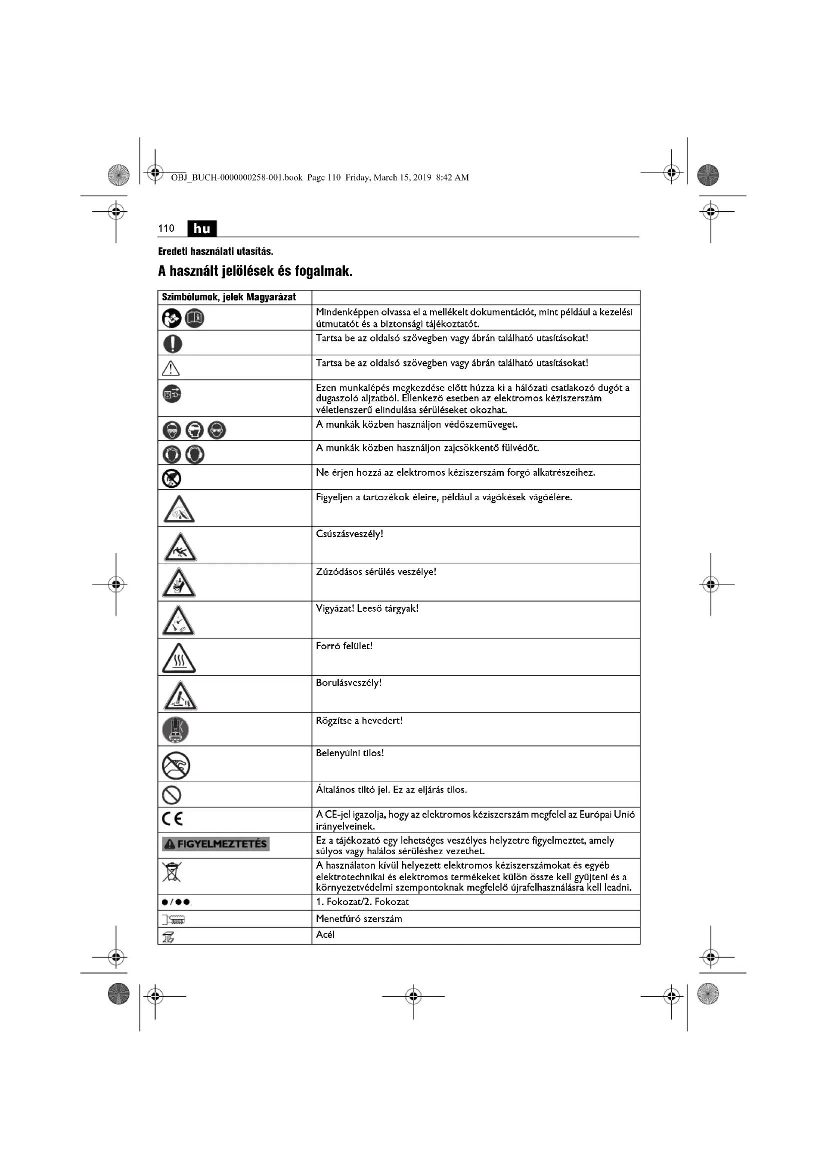 Eredeti használati utasítás. A használt jelölések és fogalmak. Szimbólumok, jelek Magyarázat Mindenképpen olvassa el a mellékelt dokumentációt, mint például a kezelési útmutatót és a biztonsági tájékoztatót. Tartsa be az oldalsó szövegben vagy ábrán található utasításokat! Tartsa be az oldalsó szövegben vagy ábrán található utasításokat! Ezen munkalépés megkezdése előtt húzza ki a hálózati csatlakozó dugót a dugaszoló aljzatból. Ellenkező esetben az elektromos kéziszerszám véletlenszerű elindulása sérüléseket okozhat. A munkák közben használjon védőszemüveget. A munkák közben használjon zajcsökkentő fülvédőt. Ne érjen hozzá az elektromos kéziszerszám forgó alkatrészeihez. Figyeljen a tartozékok éleire, például a vágókések vágóélére. Csúszásveszély! Zúzódásos sérülés veszélye! Vigyázat! Leeső tárgyak! Forró felület! Borulásveszély! Rögzítse a hevedert! Belenyúlni tilos! Általános tiltó jel. Ez az eljárás tilos. A CE-jel igazolja, hogy az elektromos kéziszerszám megfelel az Európai Unió irányelveinek. Ez a tájékozató egy lehetséges veszélyes helyzetre figyelmeztet, amely súlyos vagy halálos sérüléshez vezethet. A használaton kívül helyezett elektromos kéziszerszámokat és egyéb elektrotechnikai és elektromos termékeket külön össze kell gyűjteni és a környezetvédelmi szempontoknak megfelelő újrafelhasználásra kell leadni.